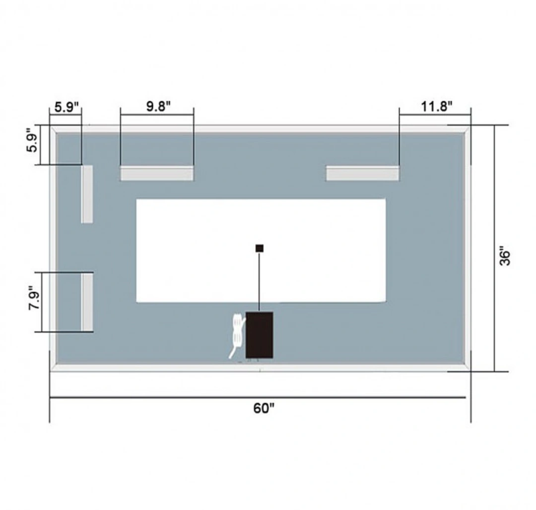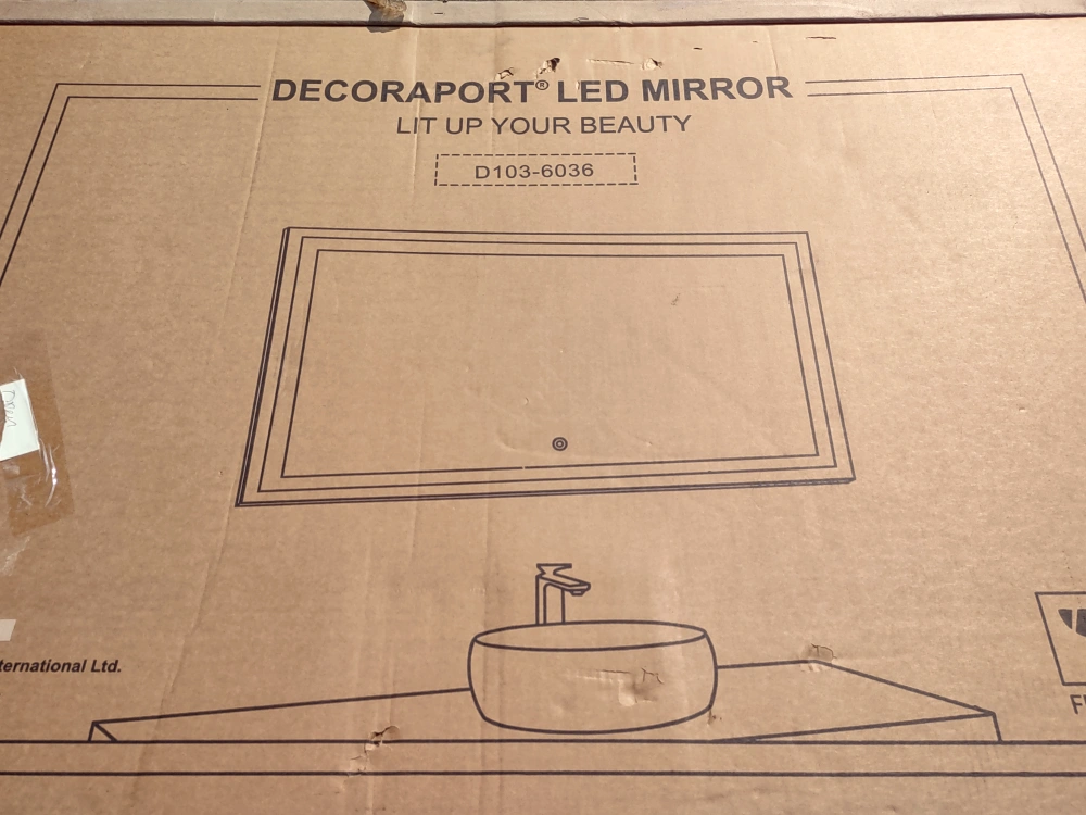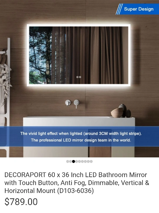 This is a DECORAPORT LED bathroom mirror with a touch button, anti fog, dimmable light, and a vertical or horizontal mount option. The mirror is 60 inches wide and 36 inches high.