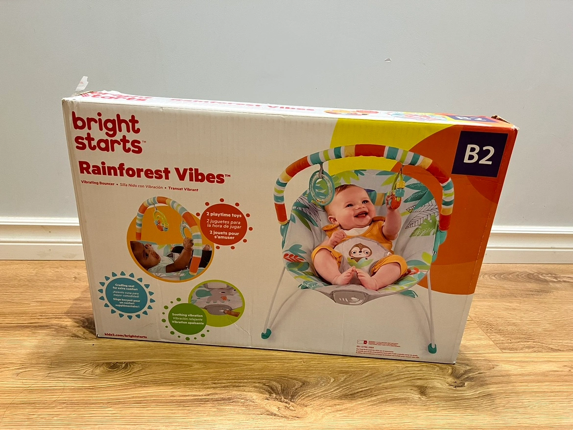 This is a gently used baby bouncer from Bright Starts with a Rainforest Vibes design. It is in very good condition and comes with all original parts. It has multiple vibration settings, and comes with two toys for your baby to play with. It is machine washable.