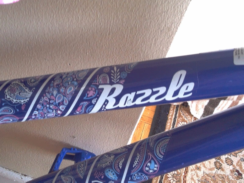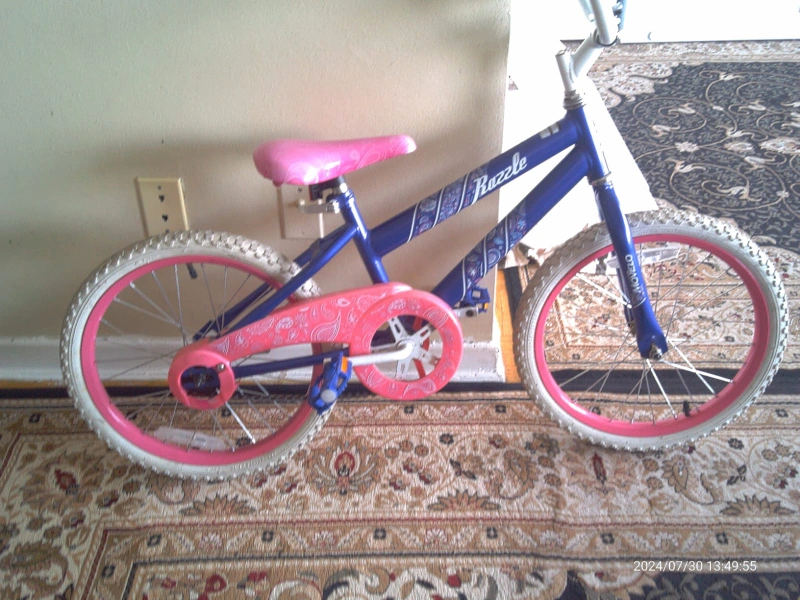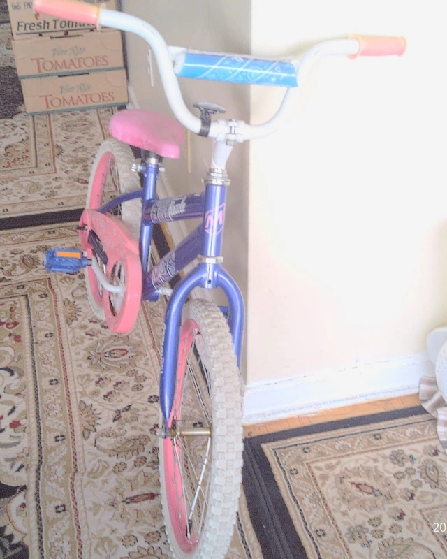 This is a blue and pink girls' bike with training wheels. The bike is in good condition. It has a pink seat, blue frame, and pink wheels. It is a great size for a child who is just starting to learn to ride a bike. it has Training wheels