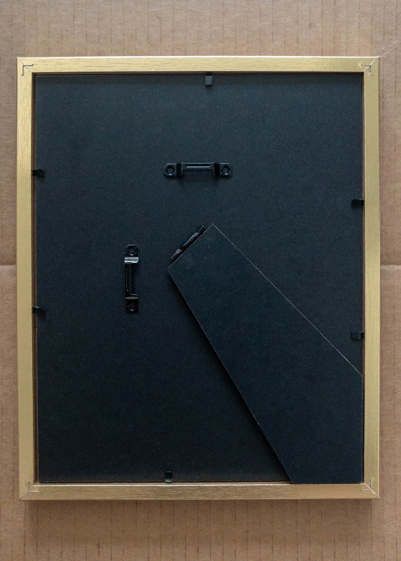 The frame has a gold matt metal-like finish to compliment the art work and can be used hanging or standing (see last image).