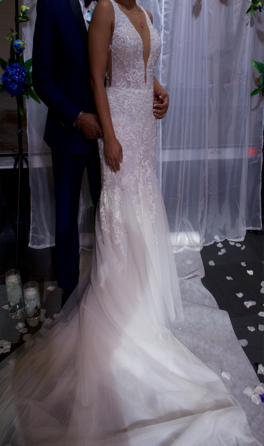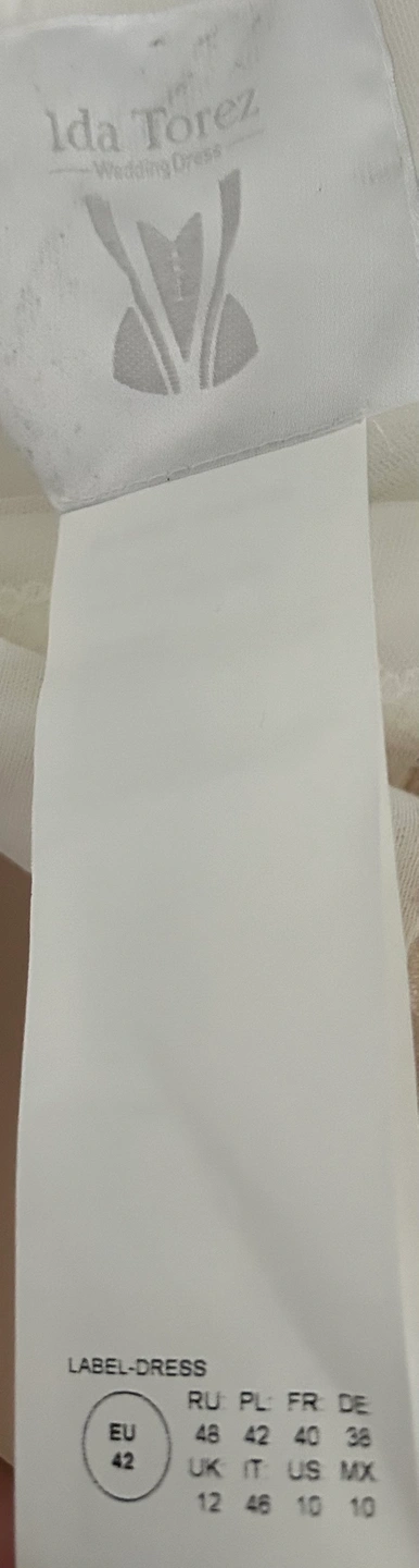 91ON SALE NOW! Buy a "Pollardi" European Designer wedding dress, from the "Ida Torez" collection, in ivory colour. This elegant, mermaid shape dress is made of artfully embroidered lace and beading throughout. The semi-transparent corset has a deep neckline, with straps, with a flesh-colored central insert. The back of the corset is a V-line shape, tied together in the center of the back. It is seductively fitting in the hip area, with a long elegant train. The dress is fastened on the side with a hidden zipper. It is labeled as a size 10 US, but fits like a size 4 US dress. See the label and images for more details. The dress has been professional cleaned and only worn once of course. *Free addon: Wedding garter included. See image for details. I will accept exact cash. Contact me when you are ready to come, try it on, and purchase. Serious buyers only please.