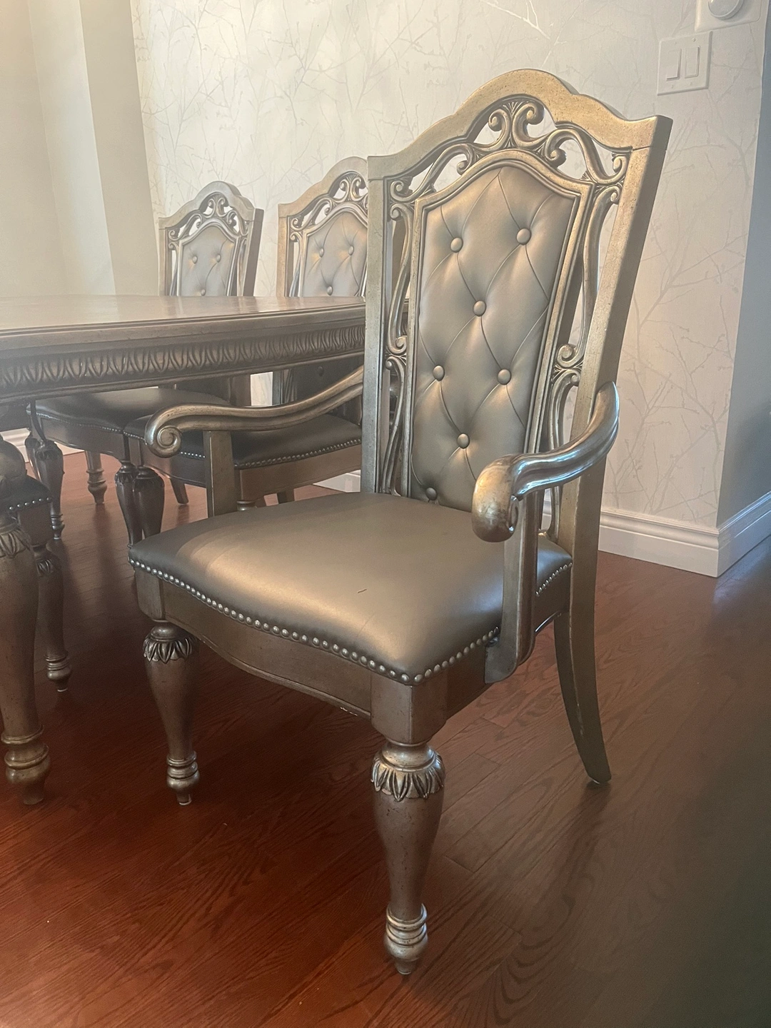 Wood table with lots of details gray color, 6 chairs 2 with arm rest, very good condition