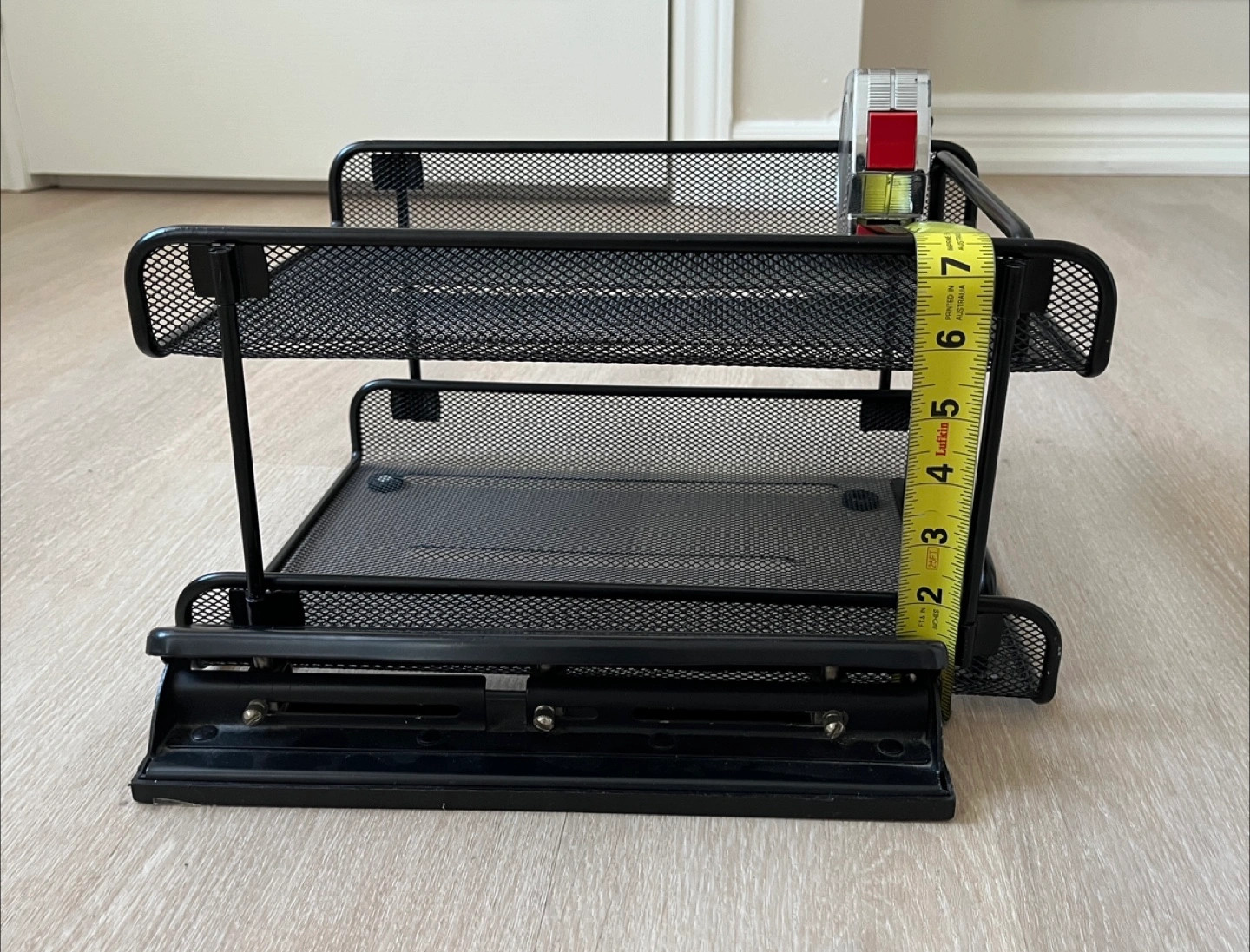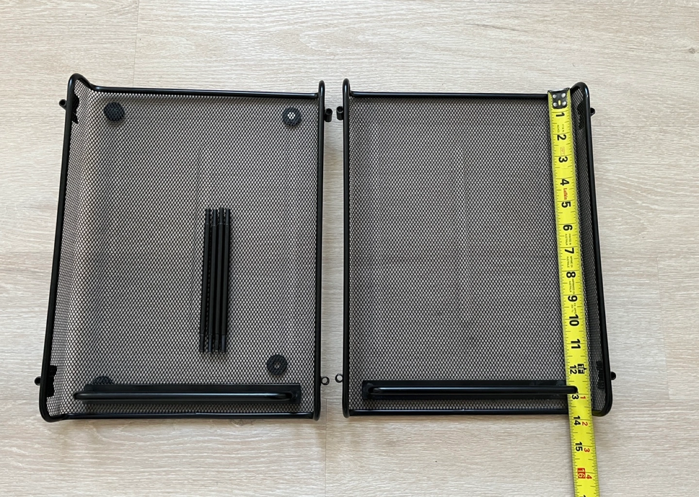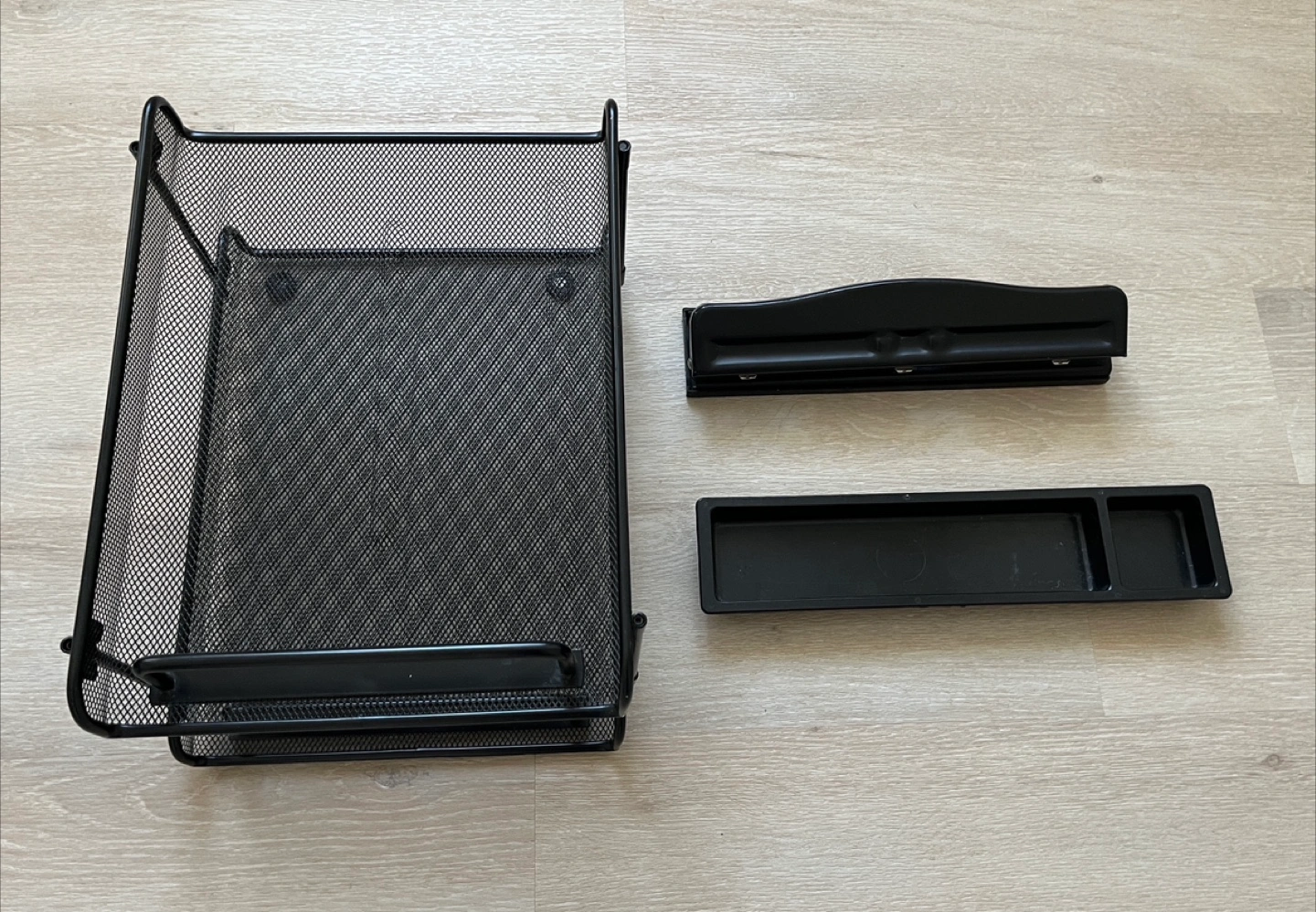 A desk organizer set in black. Includes two mesh desk trays, a three-hole punch, and a small organizer tray. The desk trays are approximately 12 inches wide and 10 inches tall. Great for keeping your workspace tidy. From non-smoke and pets-free home.