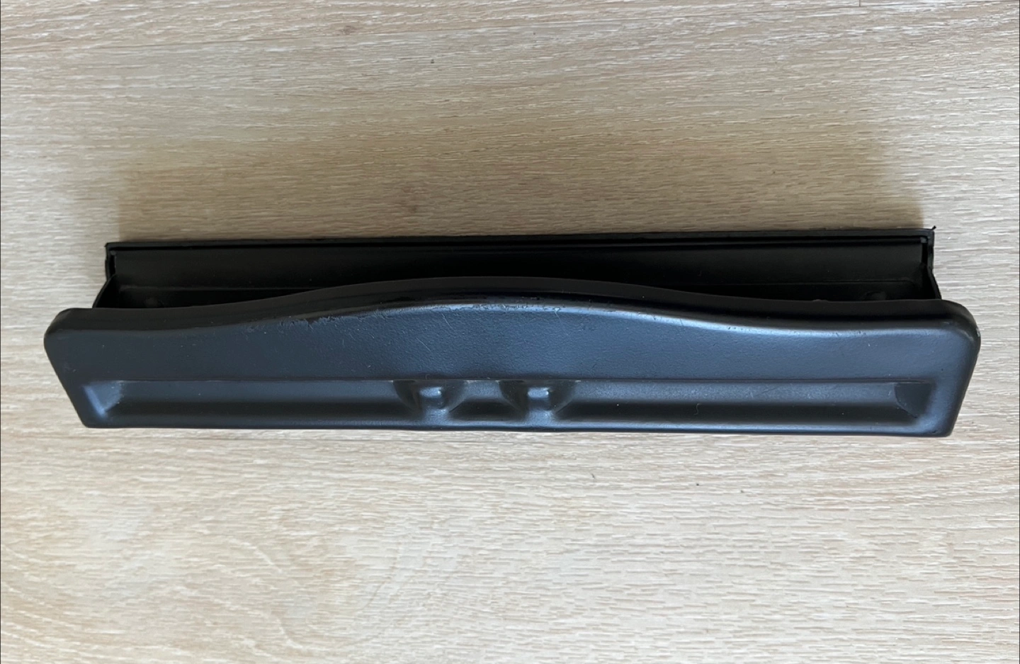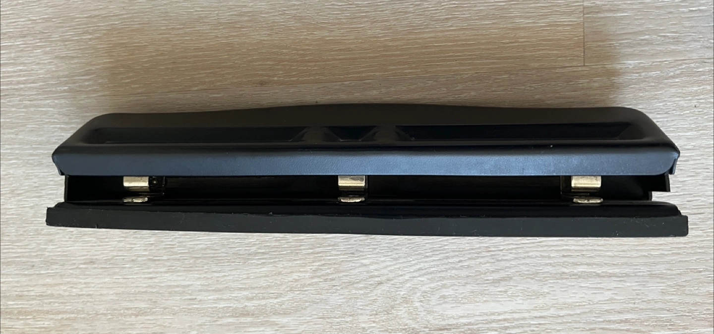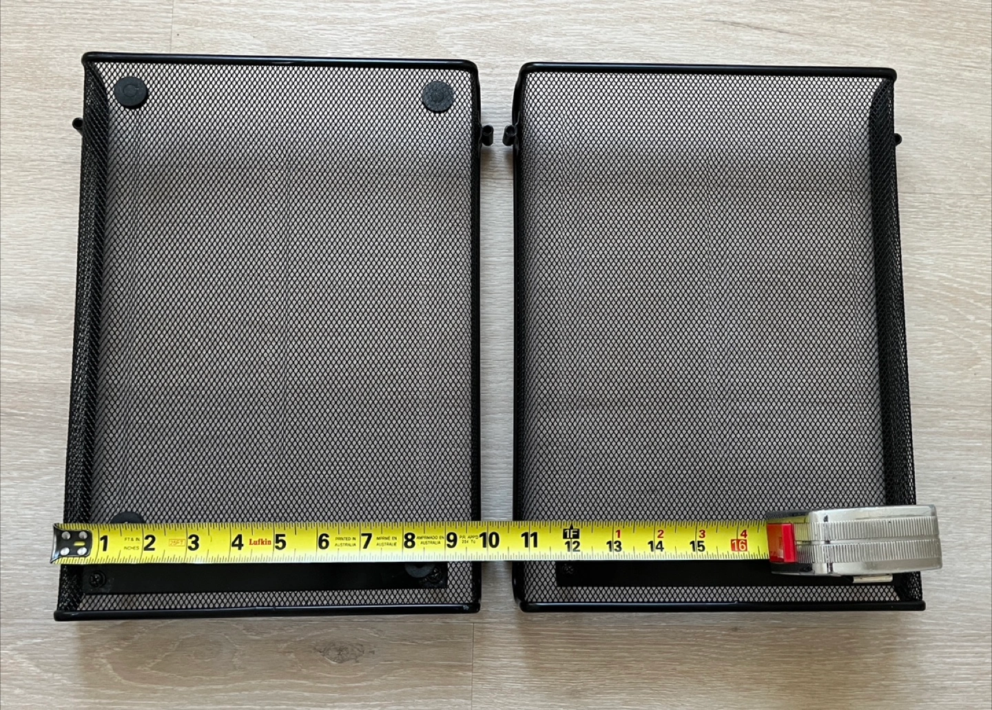 A desk organizer set in black. Includes two mesh desk trays, a three-hole punch, and a small organizer tray. The desk trays are approximately 12 inches wide and 10 inches tall. Great for keeping your workspace tidy. From non-smoke and pets-free home.