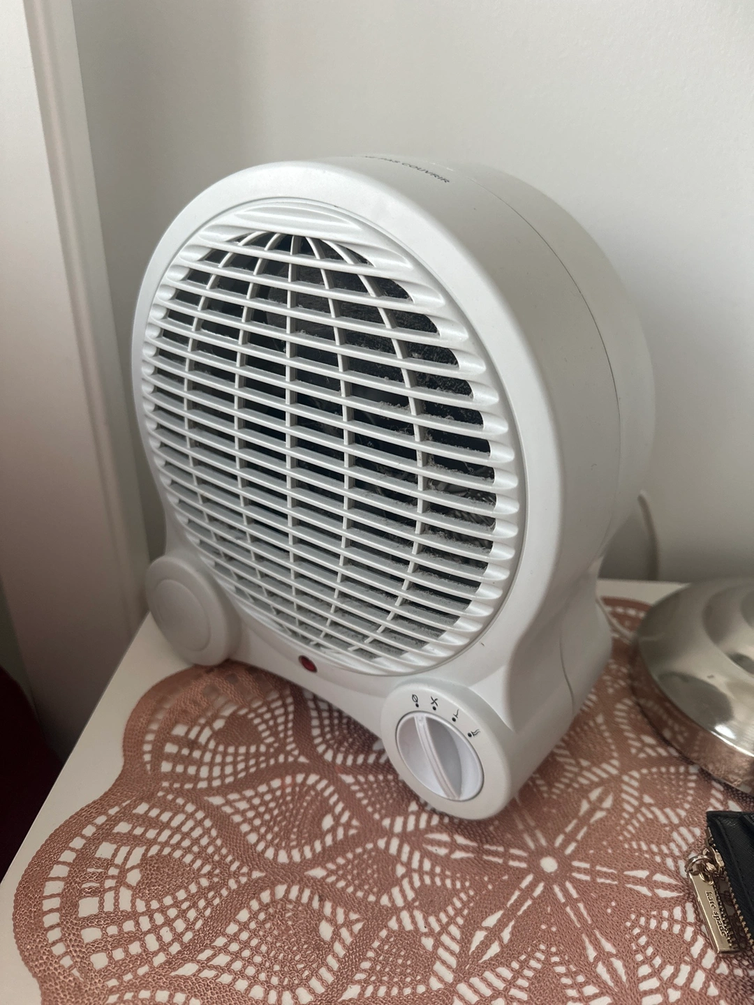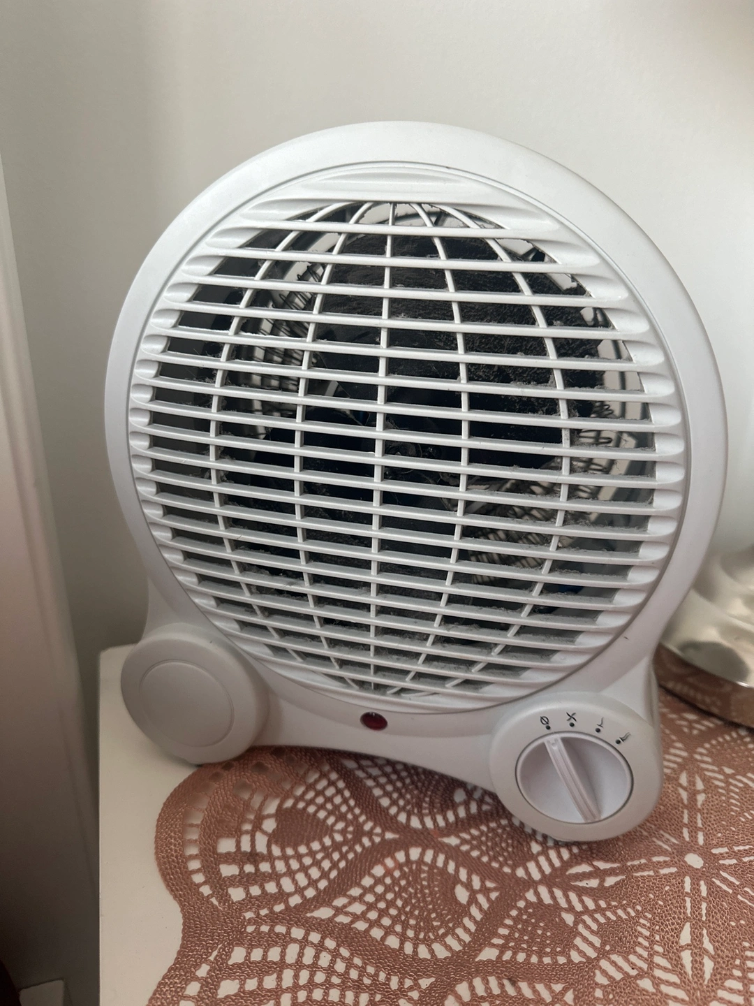 108This is a small, portable electric heater and Fan. It is white and has a round shape. The heater has a metal grate and a knob to adjust the temperature. It is in good working order and is perfect for a small room or office.