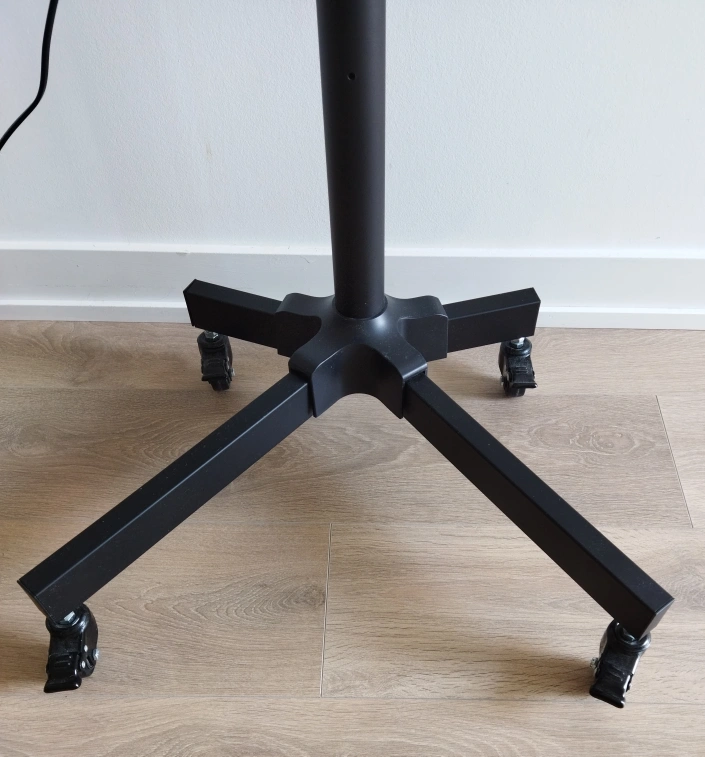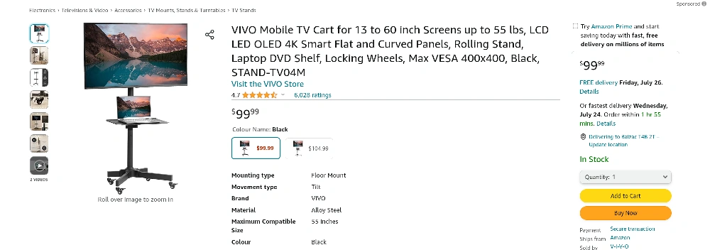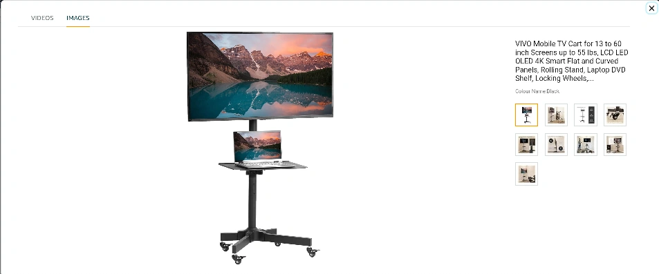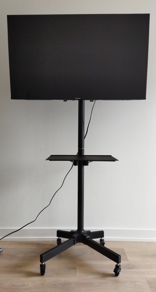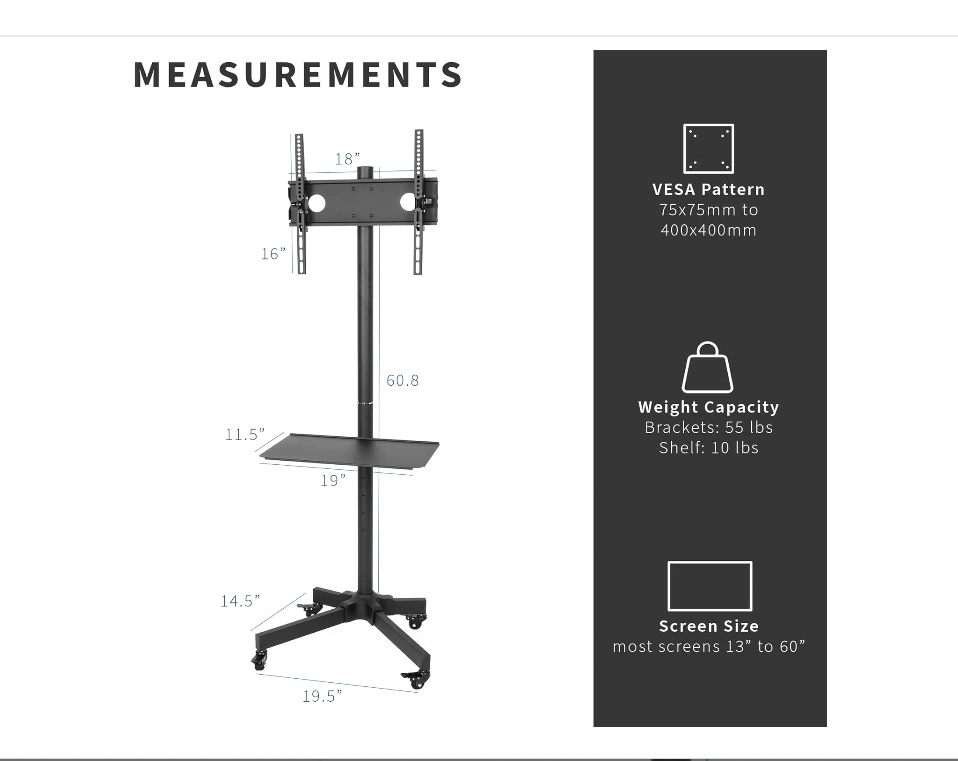 This is a TV stand that is on wheels. It can hold a TV screen up to 60 inches. The stand has a shelf that can hold a laptop or DVD player.
