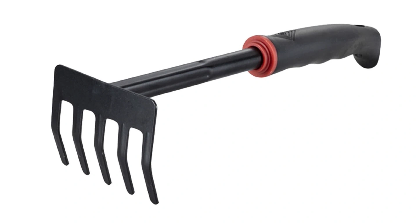 This hand rake features a durable black metal head with five tines. It has an ergonomic, rubberized black handle with a red grip accent for comfort. Great for small gardening tasks!