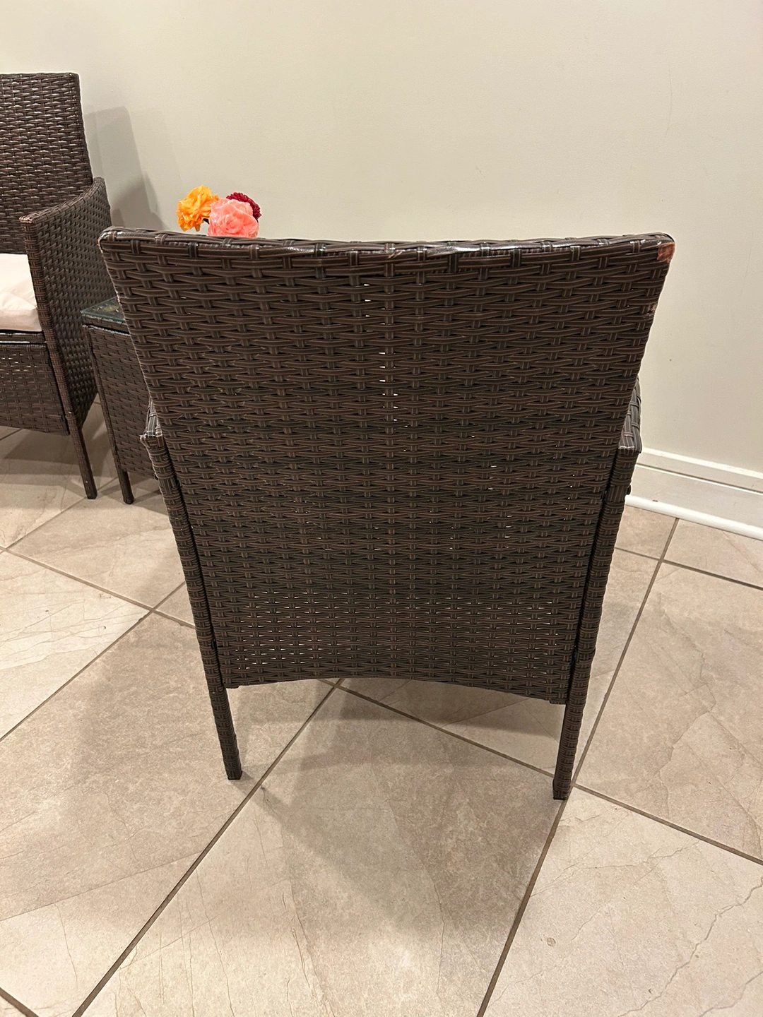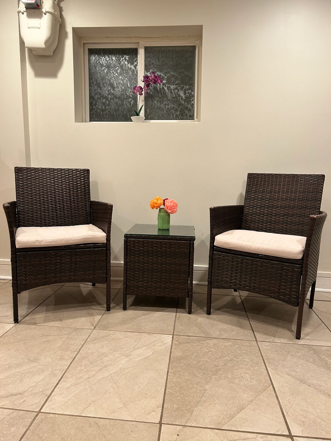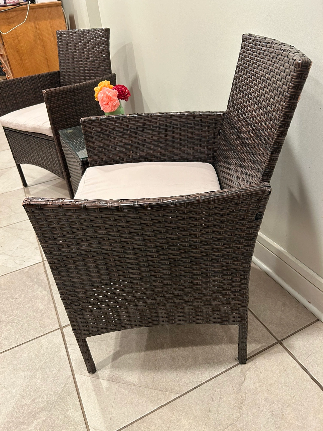 1000+Bistro set; Two chairs with seat cushions and a table with glass top. Color Brown. Could be used outdoor or indoor.
