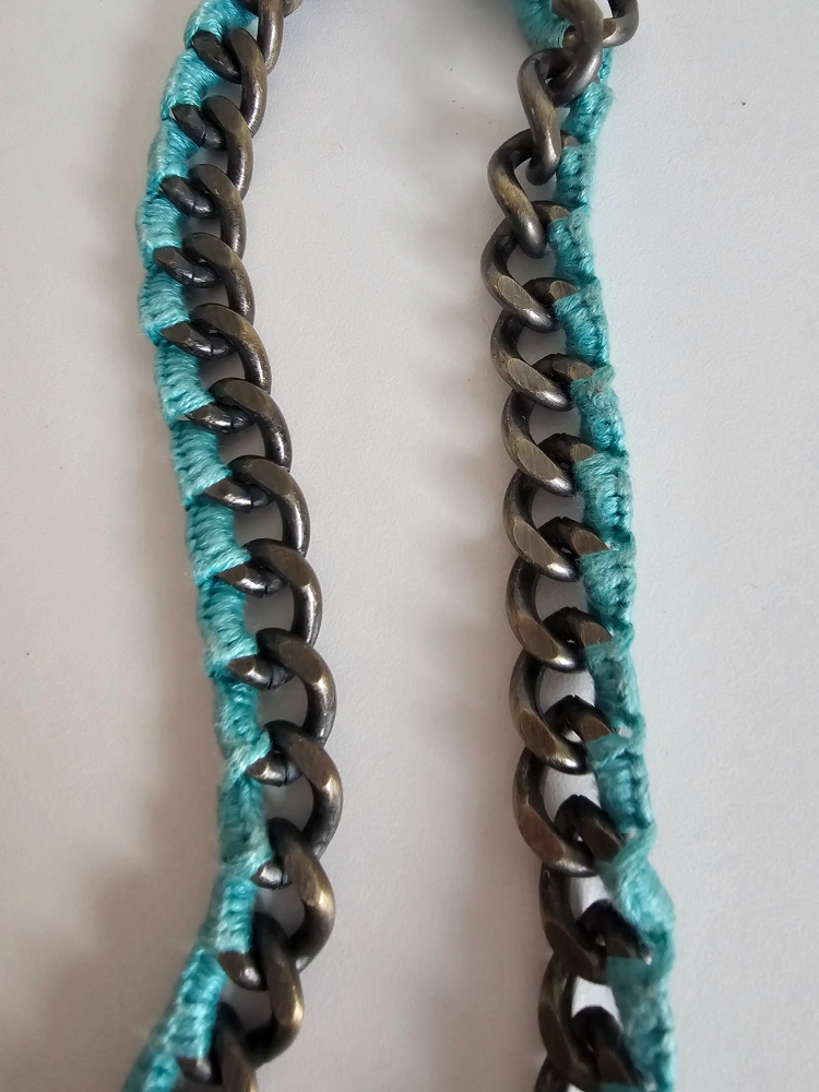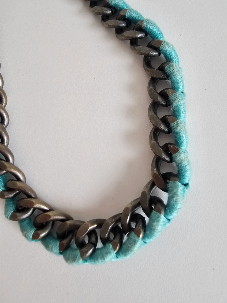A chunky, heavy, silver chain necklace with teal ribbon wrapped around the links. handmade for a fashion show, one of a kind