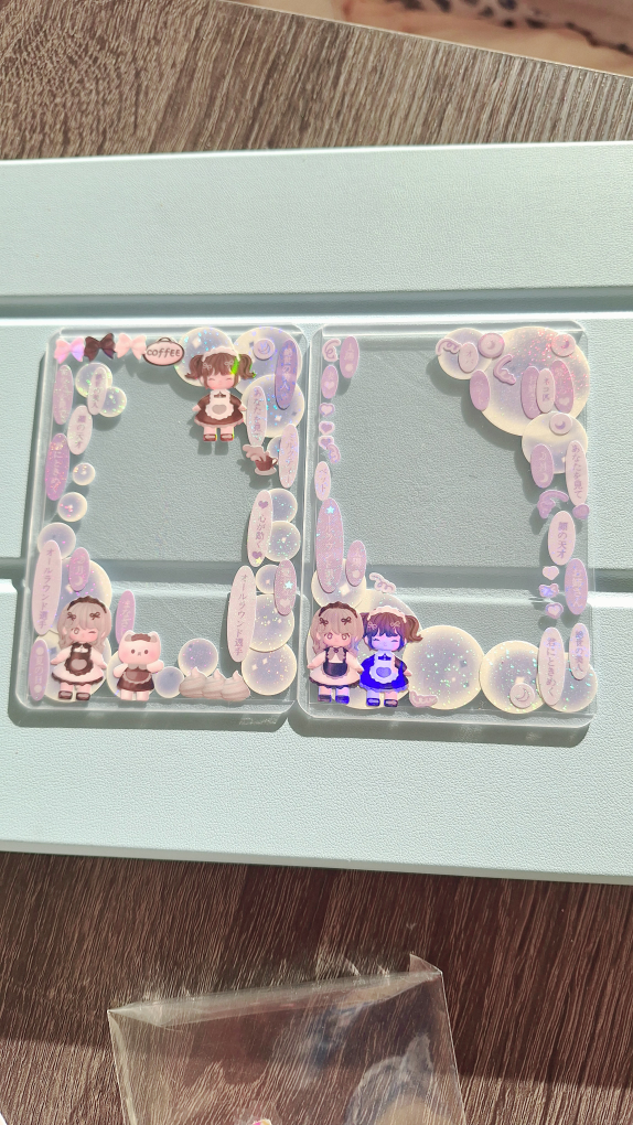 Two clear resin photo frames with embellishments and characters. Both frames have glitter embedded in the resin and cute decorations. Perfect for displaying your favorite photos!