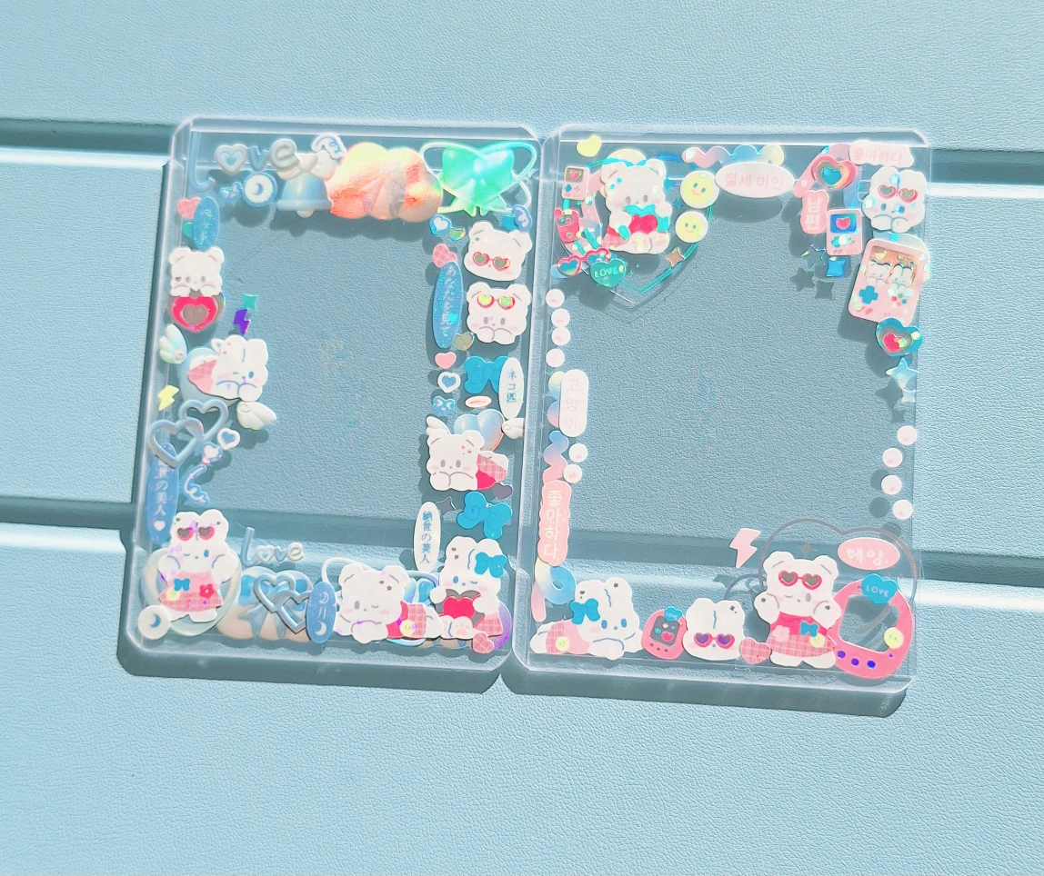 This is a double-sided clear photo frame with colorful embellishments. It can be used as a decorative item or a photo holder. It is approximately 4.5 inches tall and 3 inches wide.