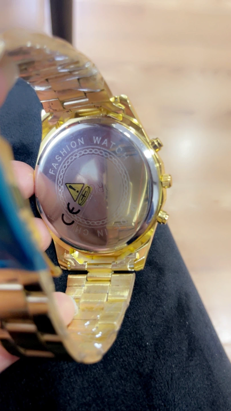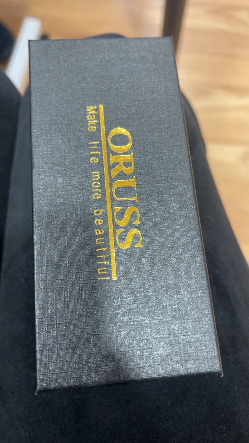 ORUSS gold fashion watch. It features a black dial with gold accents and a stainless steel band. The watch comes in its original box.