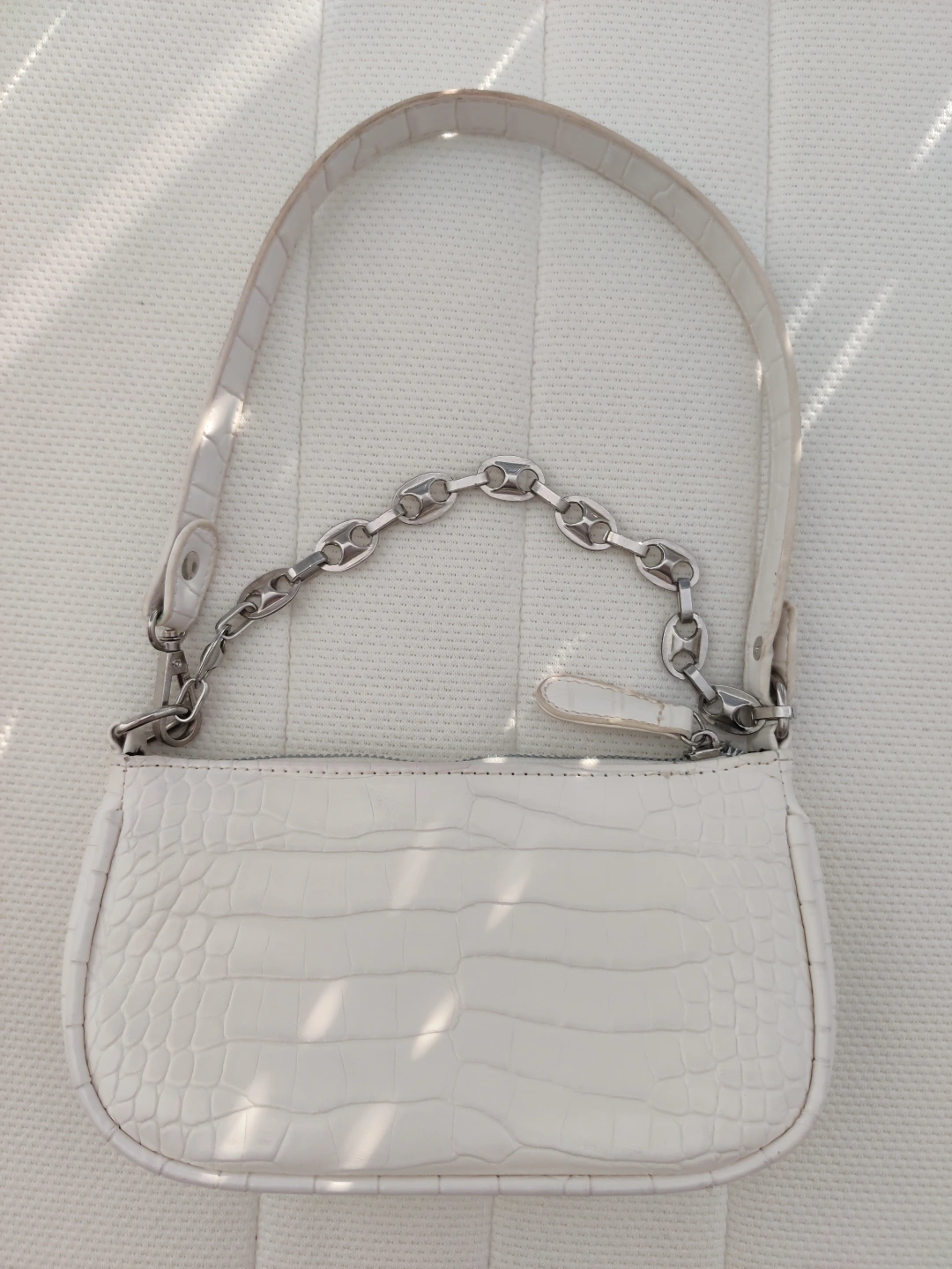 Small white handbag with crocodile embossed material, featuring a chain strap with a leather shoulder strap. Very stylish!