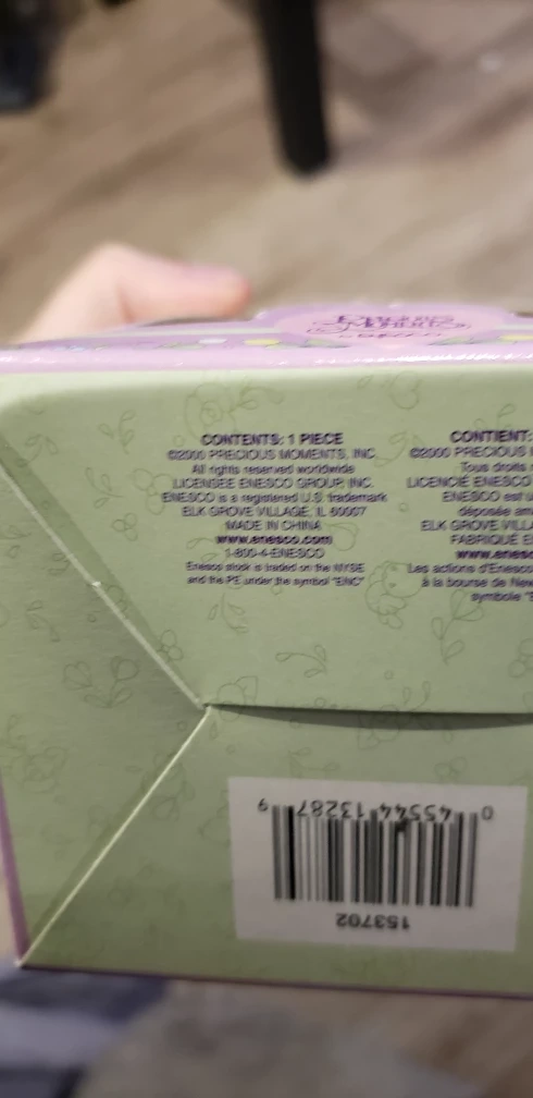A small porcelain figurine of an angel in a white dress is sitting on a hinged trinket box. The box is in the shape of a bucket and has a gold trim. The box is made by Precious Moments by Enesco.