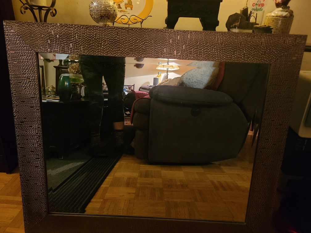 567A large decorative mirror with a detailed frame. The mirror has a reflective surface and a detailed frame. It is a great addition to any home. The mirror is in good condition. The mirror measures approximately 36 inches tall and 30 inches wide..Back paper ripped i removed ..