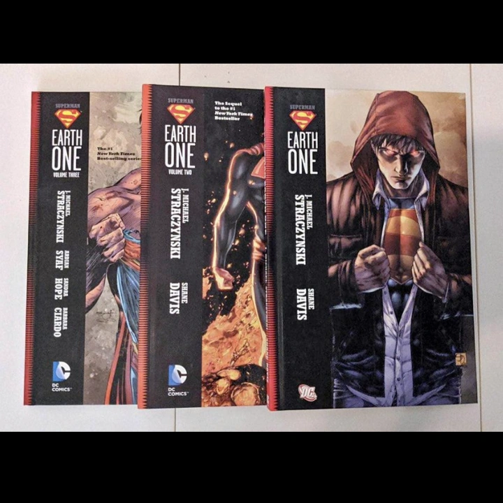751Superman Earth One HC's Vol 1-3 Graphic Novel DC Comics Comic Book Hard Cover Collection "Forget everything you know about The Man of Steel and brace yourself for a staggering new take on the world's most popular Super Hero. Best-selling, Hugo Award-winning writer J. Michael Straczynski (BRAVE AND THE BOLD, THOR, BABYLON 5) and red-hot rising star artist Shane Davis (GREEN LANTERN, SUPERMAN/BATMAN) team up for this exciting launch of the EARTH ONE graphic novel series. Set in an all-new continuity re-imagining DC's top heroes, EARTH ONE is a new wave of original, stand-alone graphic novels produced by the top writers and artists in the industry. The groundbreaking new line rockets into effect right here with the Super Hero who started it all--Superman! What would happen if the origin of The Man of Tomorrow were introduced today for the very first time? Return to Smallville and experience the journey of Earth's favorite adopted son as he grows from boy to Superman like you've never seen before!"
