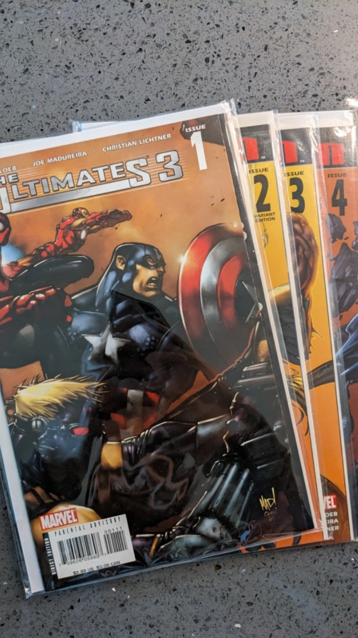 751Ultimates 3 (2007) by Jeph Loeb Issues #1-4 Marvel Comics "Written by JEPH LOEB Pencils & Cover by JOE MADUREIRA & CHRISTIAN LICHTNER Gatefold Variant Cover by JOE MADUREIRA & CHRISTIAN LICHTNER The countdown to Ultimatum begins here and when it's over, the Ultimate Universe will never be the same! And when we say that in the Ultimate Universe, you know we ain't fooling around! A year later, who are the Ultimates? After going through the tumultuous events of the past two volumes, the Ultimates find themselves operating out of Tony Stark's mansion in New York where, no longer working for S.H.I.E.L.D., they have to make it on their own. But, a terrible secret is about to tear them apart and bring about a murder at the mansion! One of Earth's greatest heroes will die and there'll be plenty of suspects! New Members! New Adventures! And New Secrets! All this and Ultimate Venom too! Join Eisner winner and Emmy-nominated writer Jeph Loeb (TV's Heroes, FALLEN SON) and the superstar team of Joe Madureira & Christian Lichtner (UNCANNY X-MEN, Battle Chasers) as they take the Ultimates on their wildest ride yet! "