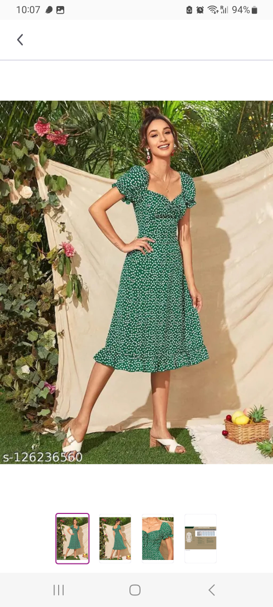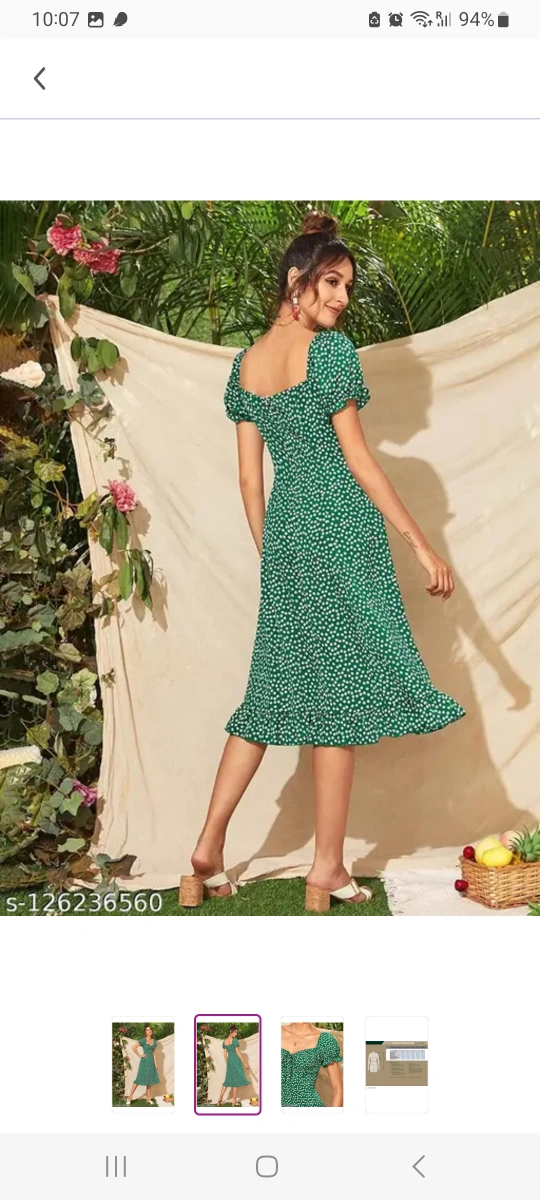 A cute and stylish green dress with a floral print. It has a sweetheart neckline and short sleeves. The dress has a fitted bodice and a flowing skirt.