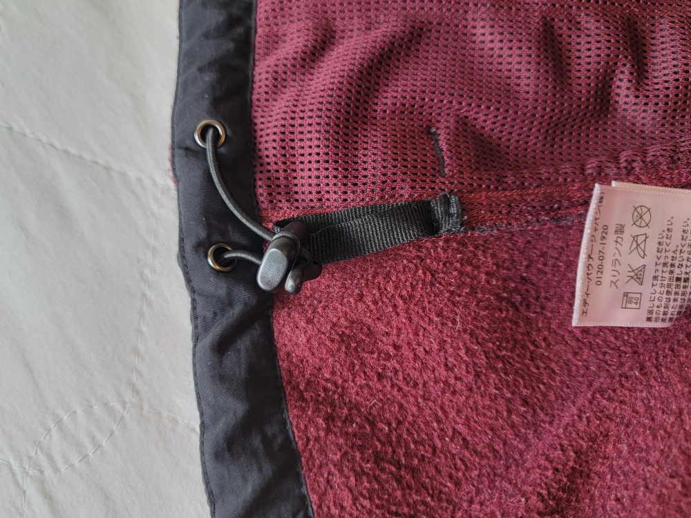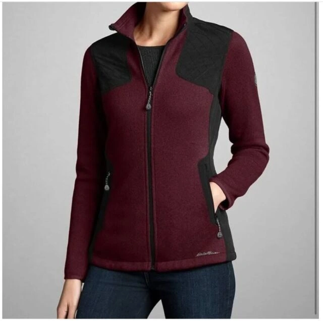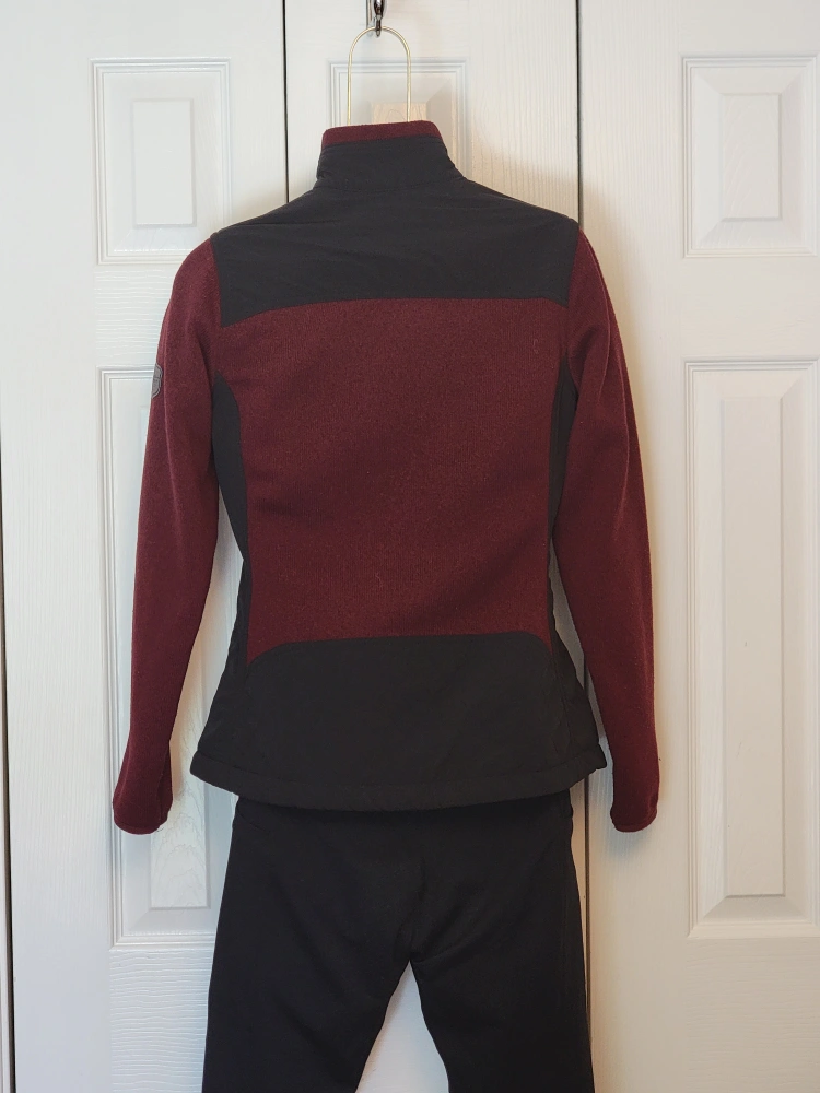 The jacket has a burgundy colour with black panels and is a zip-up style.