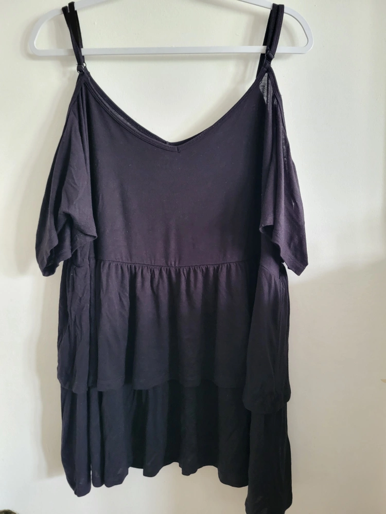 Black Torrid off the shoulder top. The top has short sleeves, a v-neckline and a tiered skirt. The top is a size 3. The top is made of 95% rayon and 5% spandex. It is made in Vietnam.