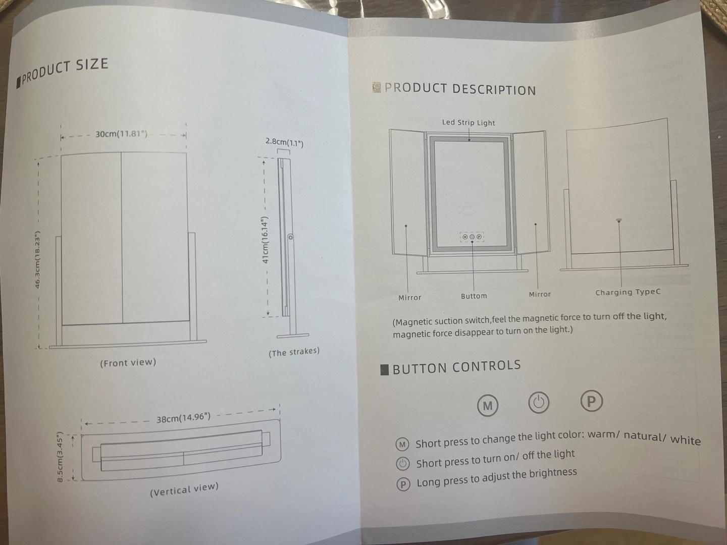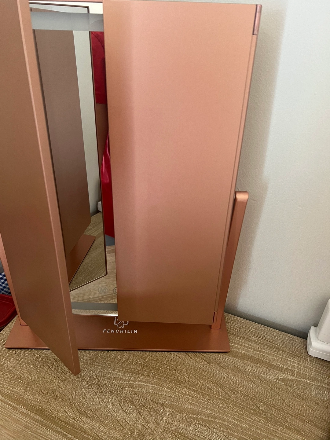 Rose gold tri-fold makeup mirror with lights. The mirror is in working condition and includes a cord. It is perfect for applying makeup or doing your hair. Bought less than a year ago, works perfect like new.