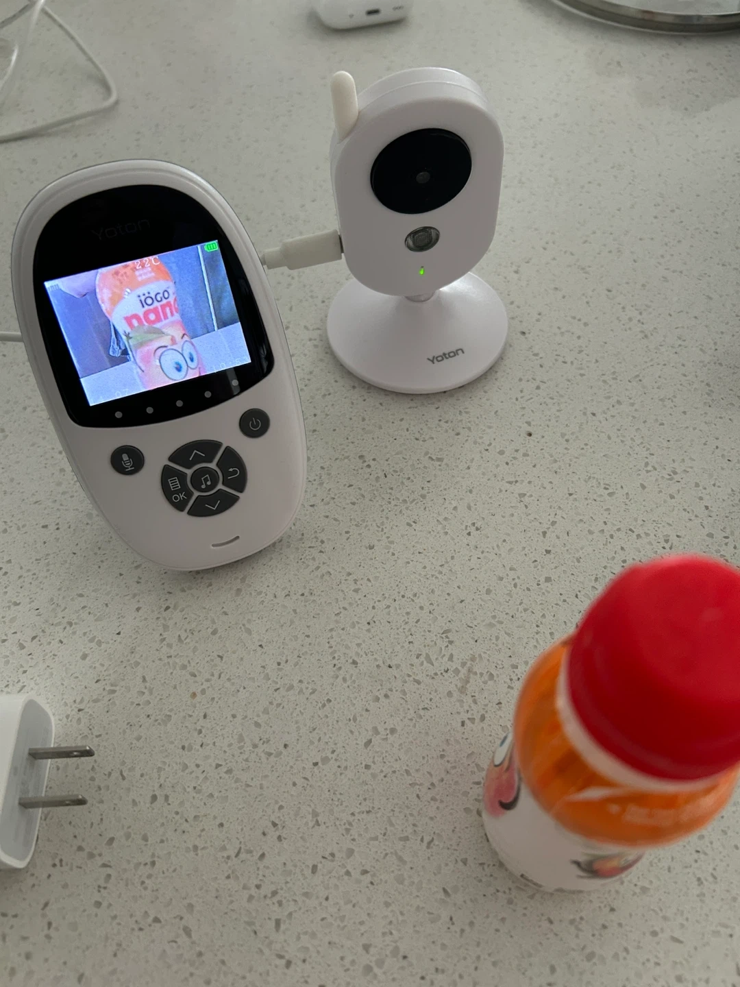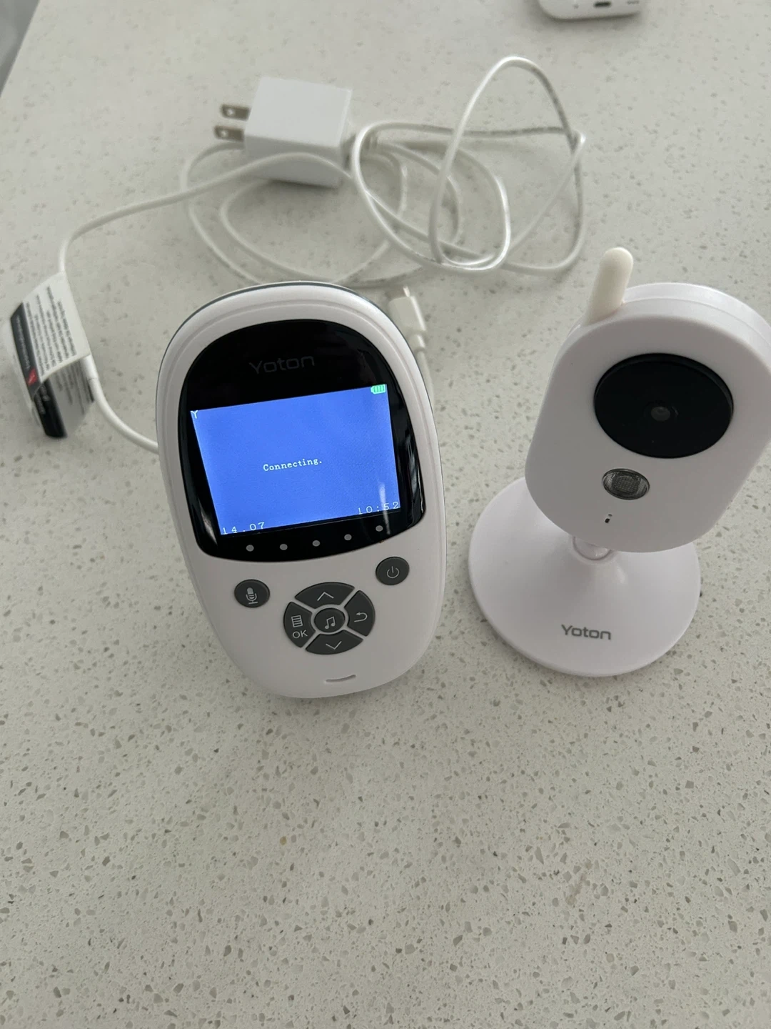 This is a Yoton baby monitor with a camera and parent unit. It's white and includes the necessary power adapter.