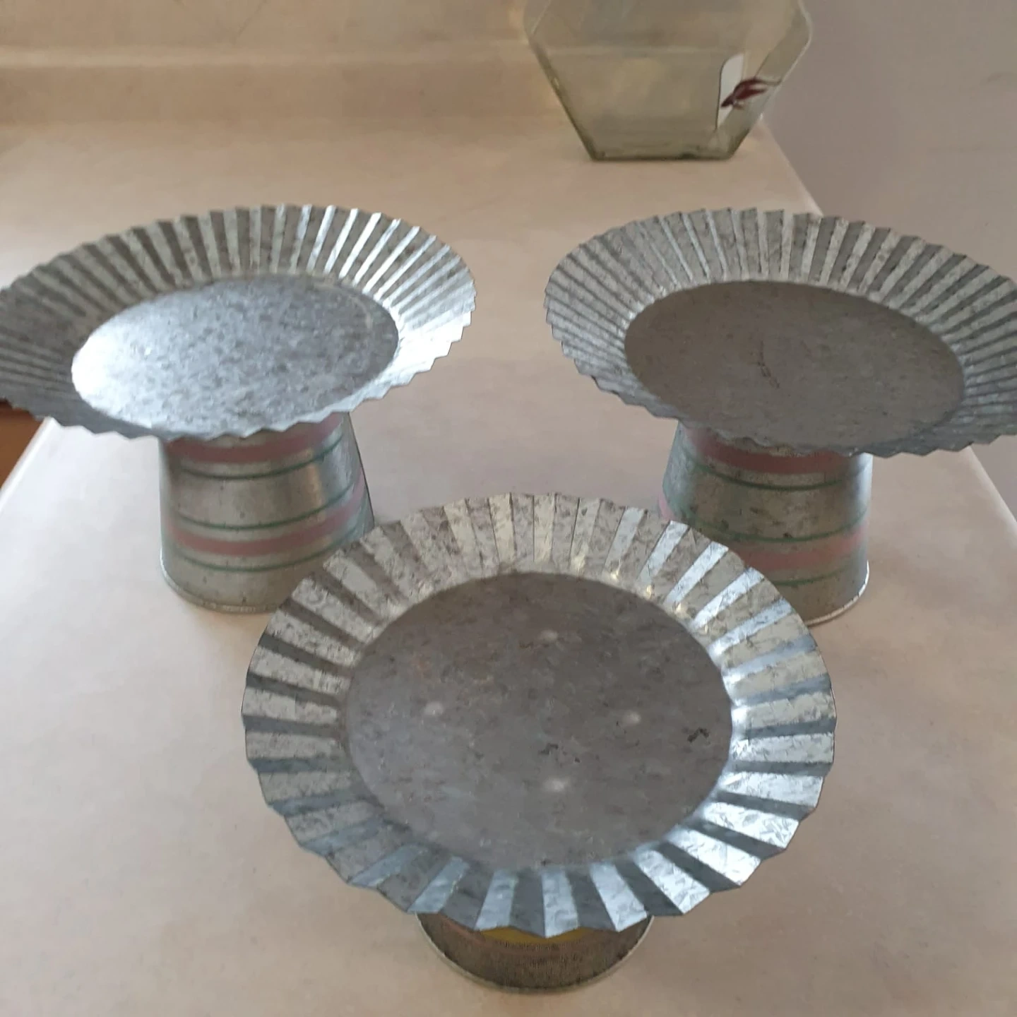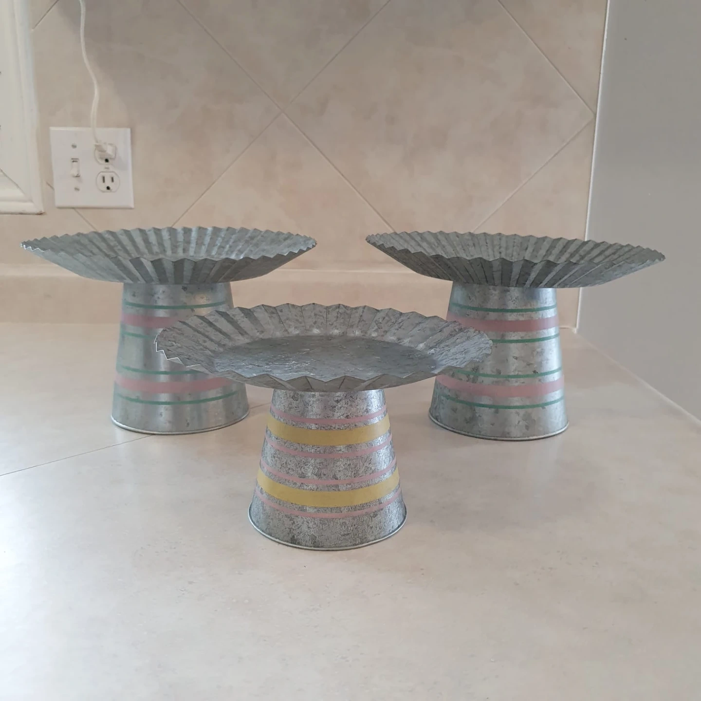 Set of three galvanized metal cake plates for Easter with fluted edges. Each plate has a decorative base with pink and yellow stripes. They're perfect for displaying desserts or serving treats at parties!