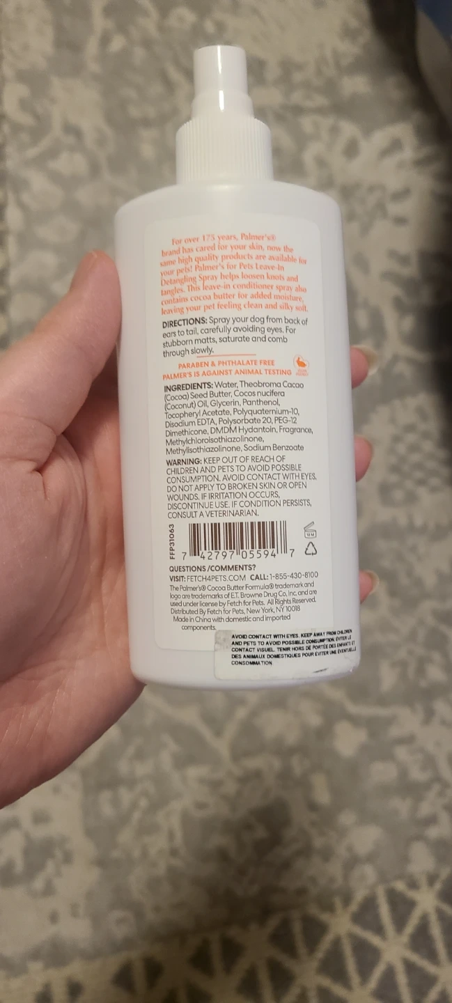Palmer's Cocoa Butter Leave-In Detangling Spray for Pets. Helps loosen knots and adds shine. Formula is paraben & phthalate free and made with cocoa butter for added moisture. 237 mL or 8 fl.oz.