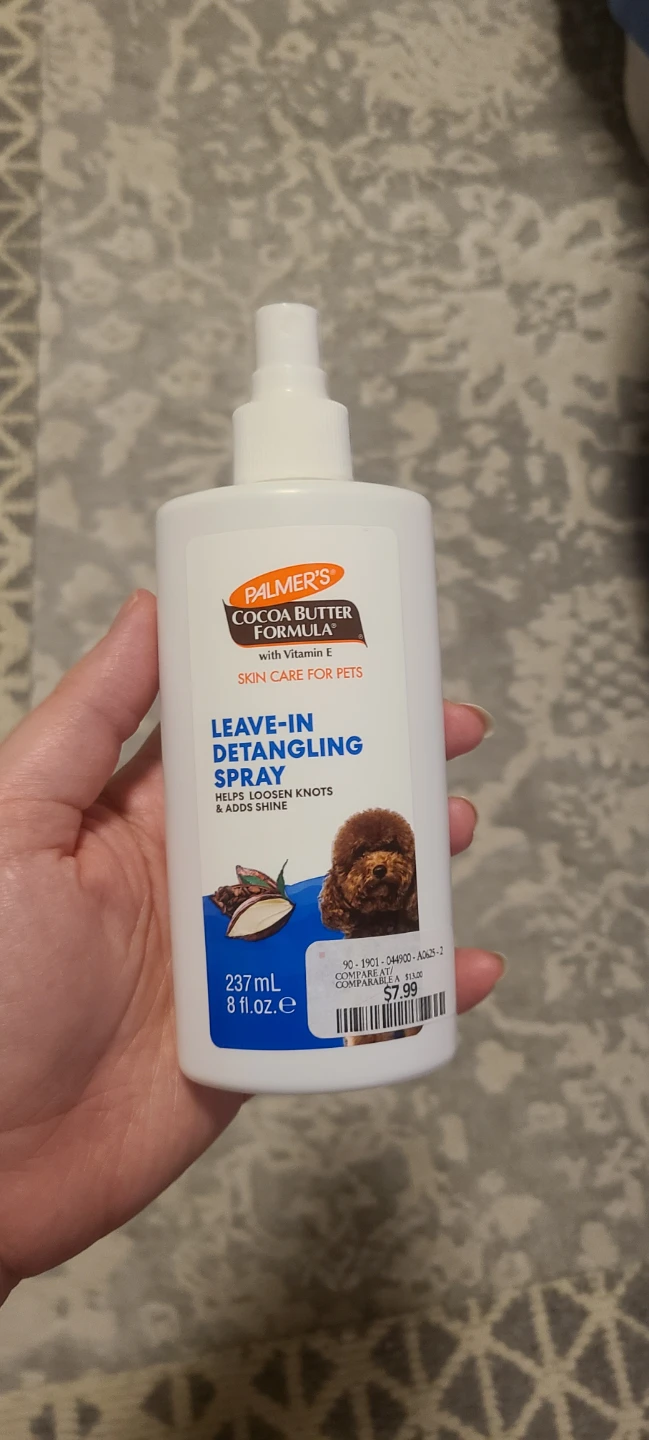 Palmer's Cocoa Butter Leave-In Detangling Spray for Pets. Helps loosen knots and adds shine. Formula is paraben & phthalate free and made with cocoa butter for added moisture. 237 mL or 8 fl.oz.