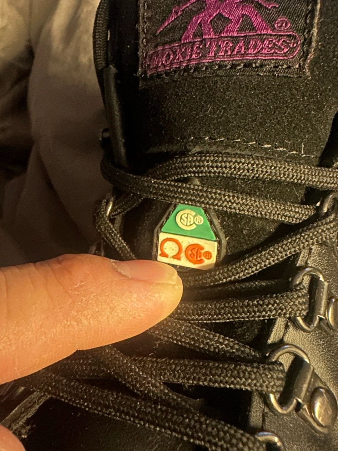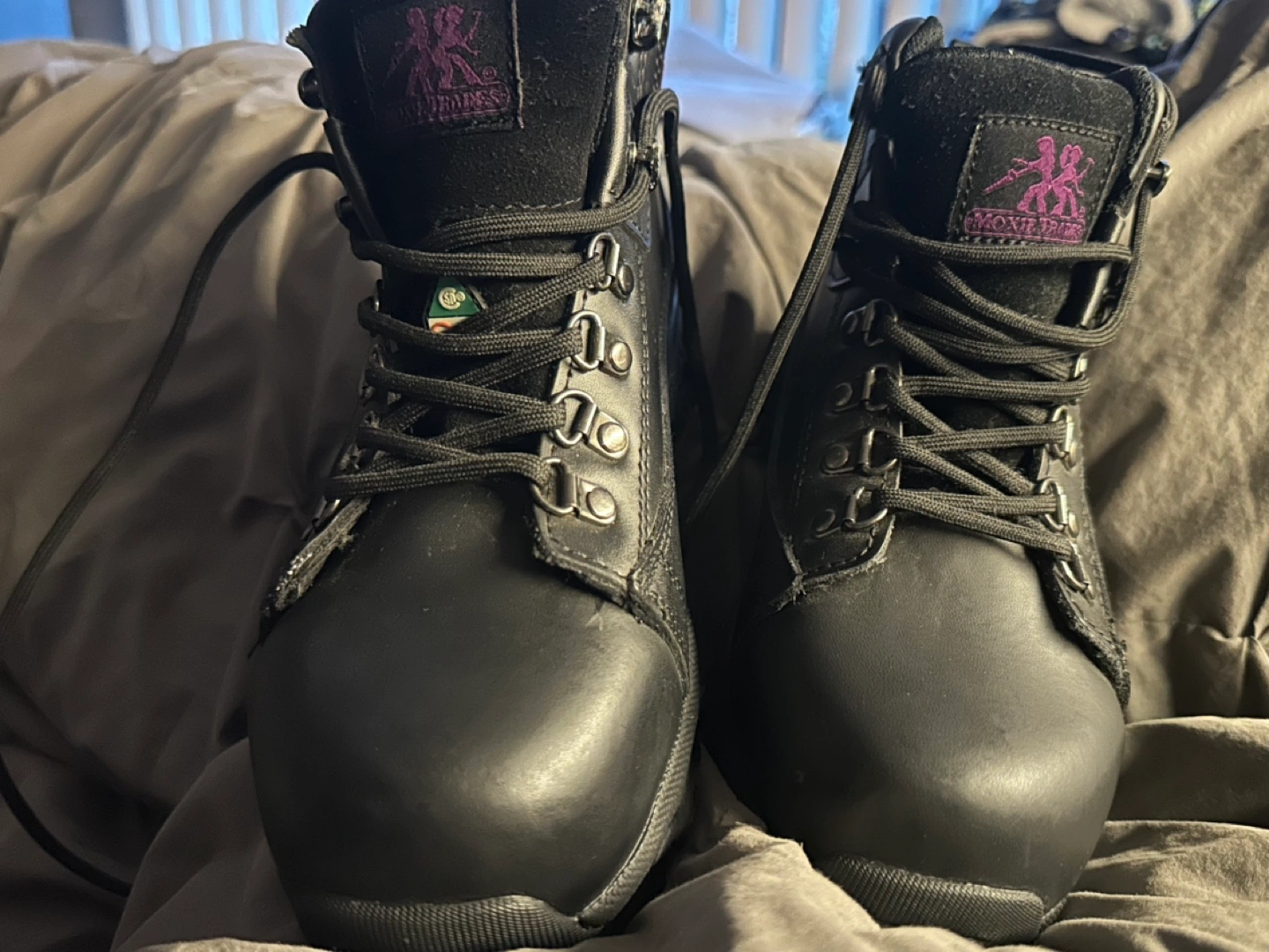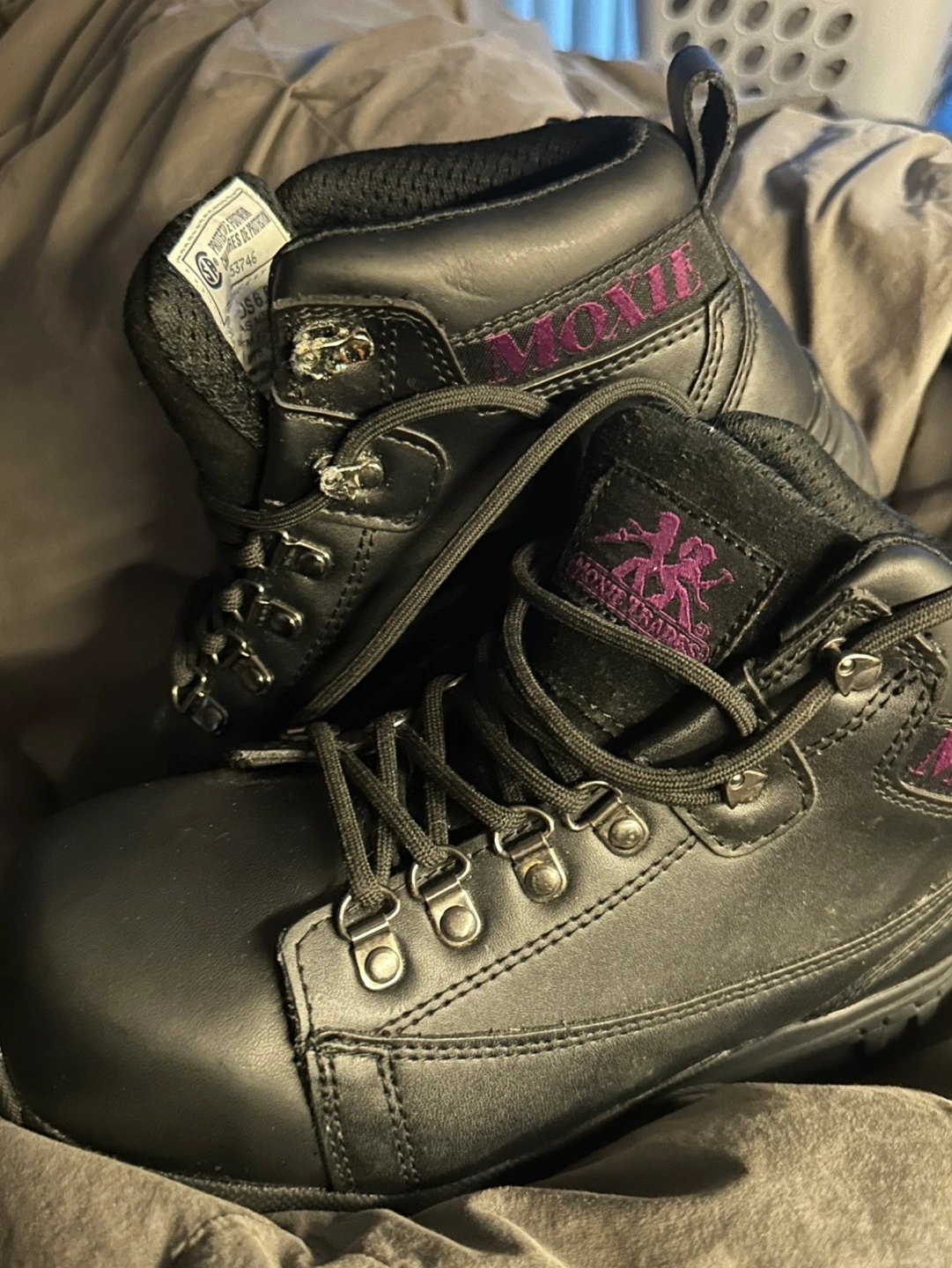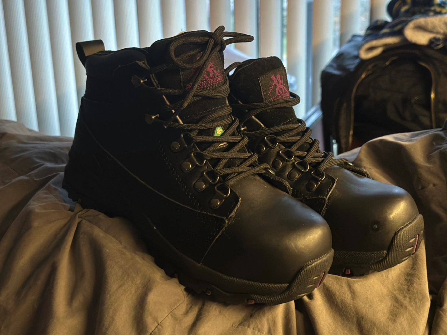 Pair of steel toe black leather work boots. Lace-up style. Purple accents. Durable soles. Good for work or outdoor activities.