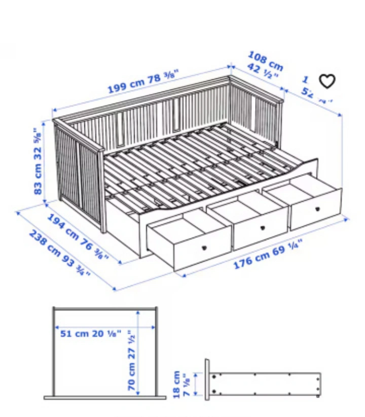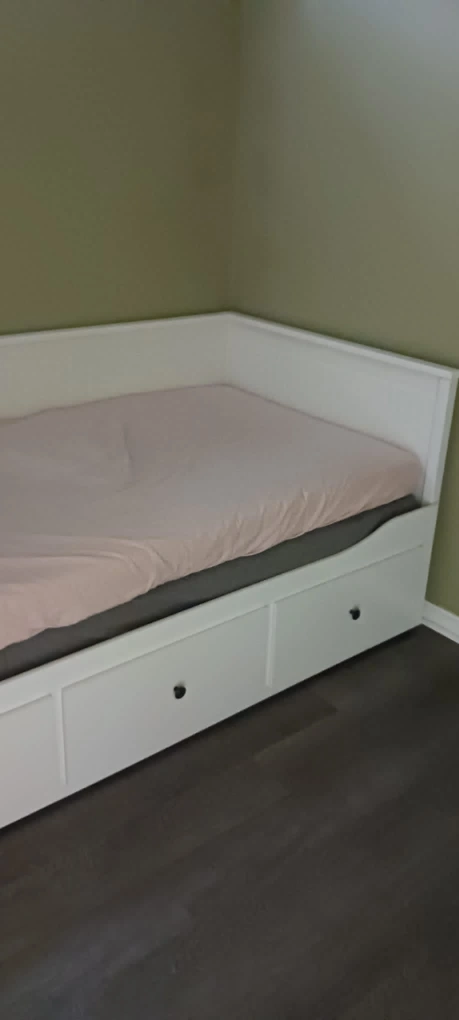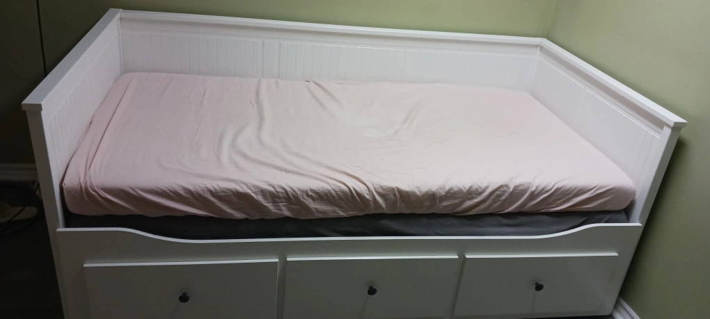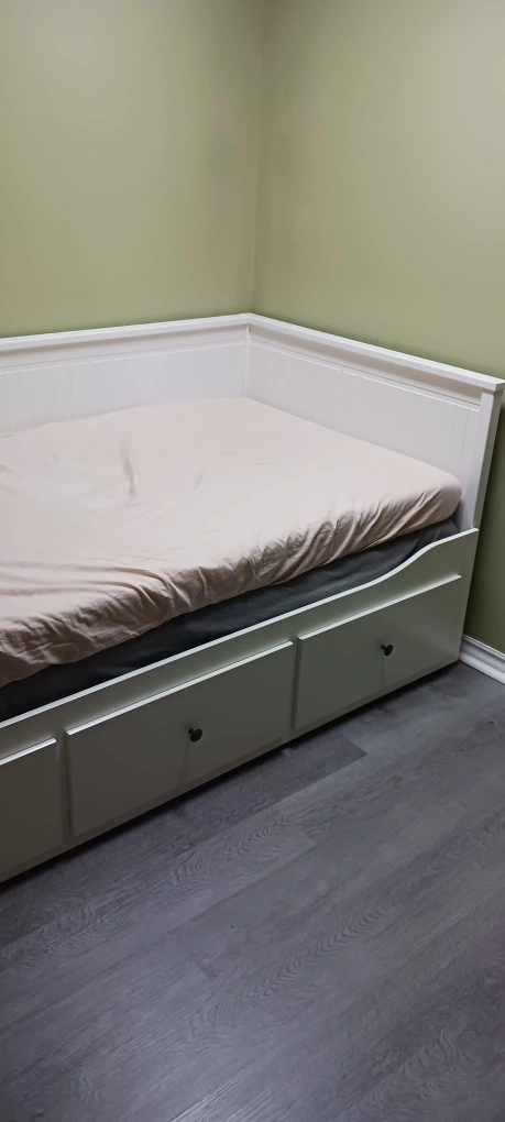 115This daybed comes with 3 drawers, perfect for storage. The daybed can be used as a single bed or converted to a double bed. It is made of solid wood and has a white finish. CASH ONLY without mattress