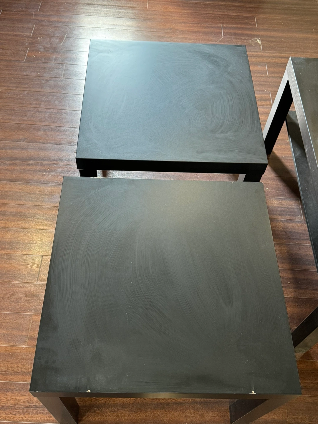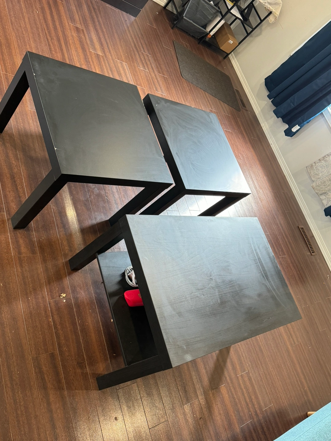 Three-piece black coffee table set including one large coffee table and two side tables.
