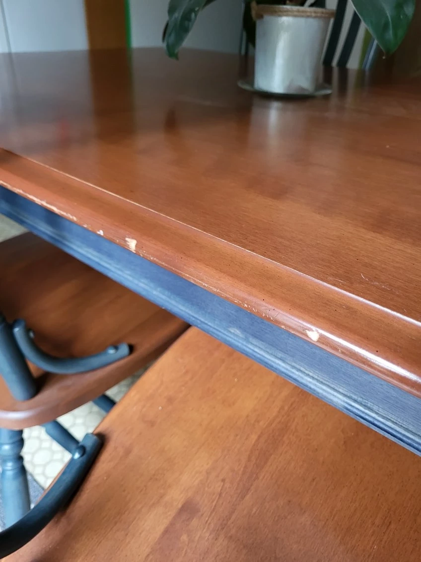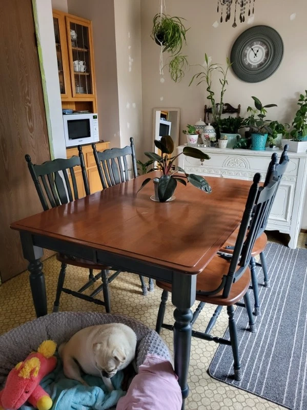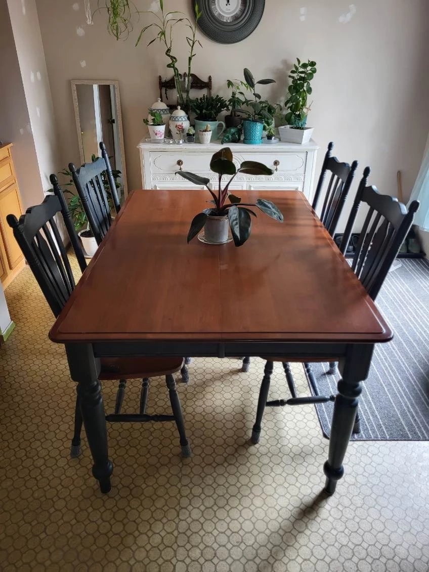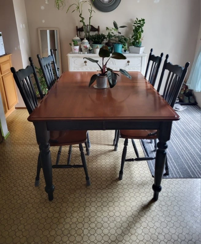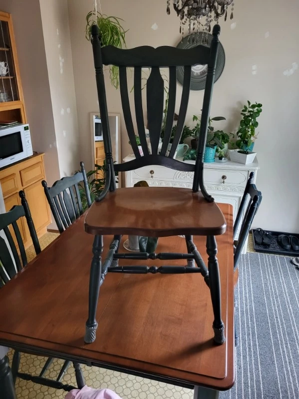 πMade in Canada. Very sturdy, solid wood. Chairs are very comfortable. Will include the foot cozy's with no charge. **A few minor nicks and mark's on table as shown in the photographs above.