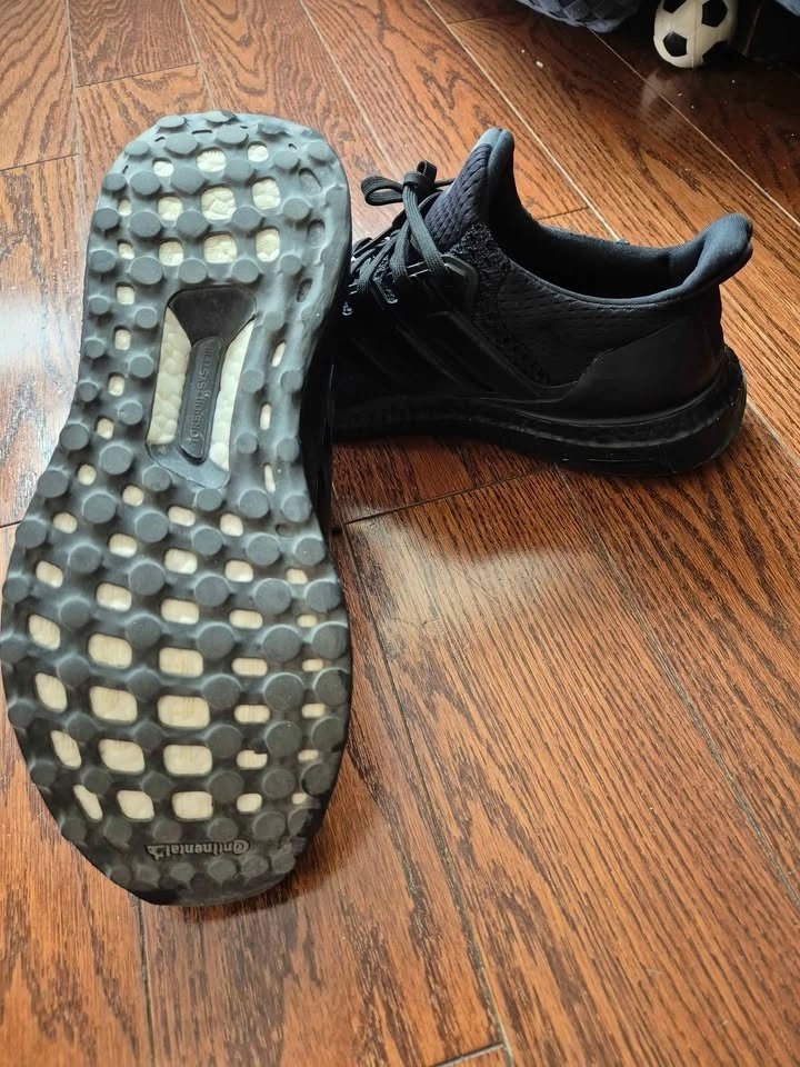 Adidas Ultraboost 1.0 in a "Triple Black" colorway. Used only 3 to 5 times, they are in excellent condition, almost like new.