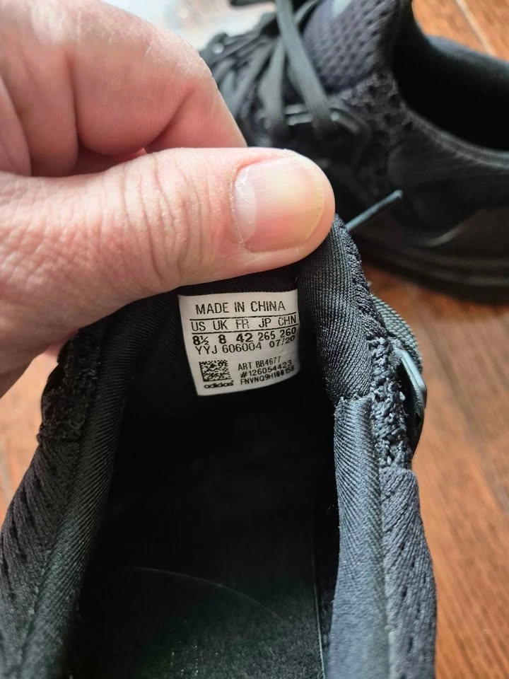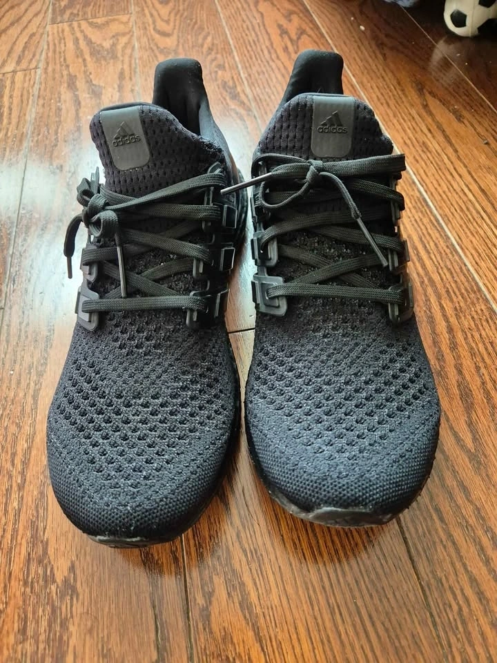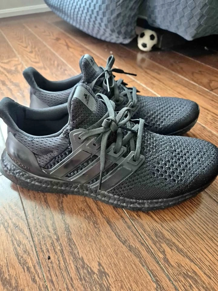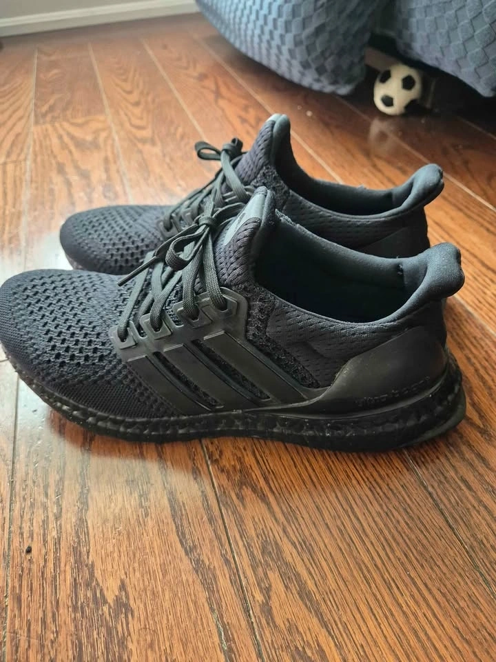 Adidas Ultraboost 1.0 in a "Triple Black" colorway. Used only 3 to 5 times, they are in excellent condition, almost like new.