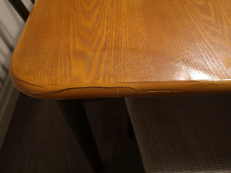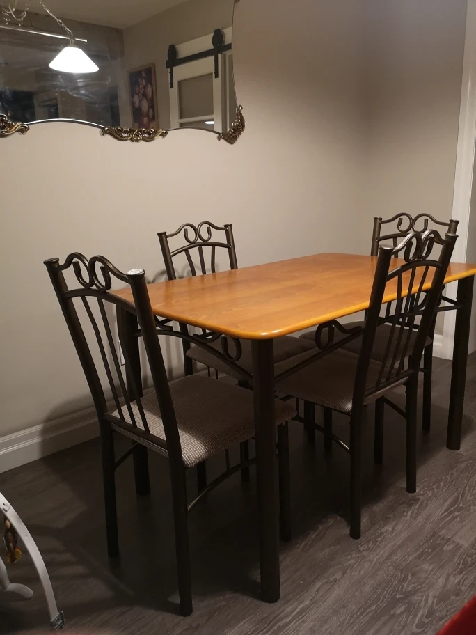 A dining table and four chairs set in a warm wood tone and metal. The table top is rectangular and the chairs are in a classic design with padded seats.