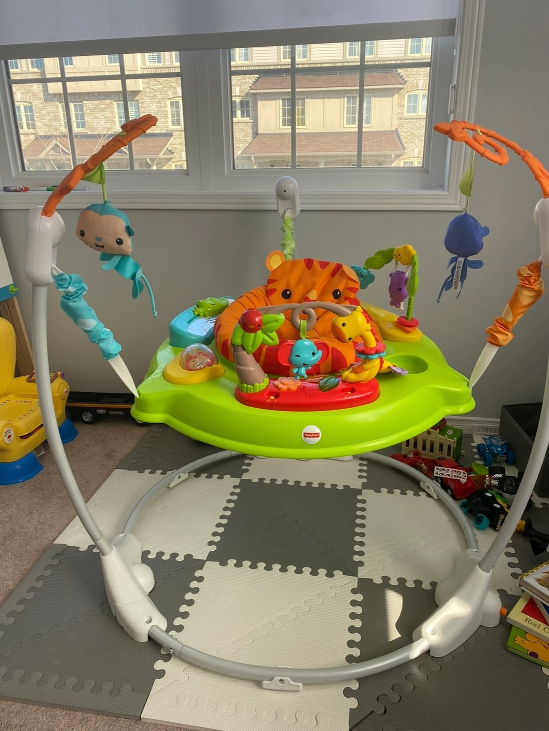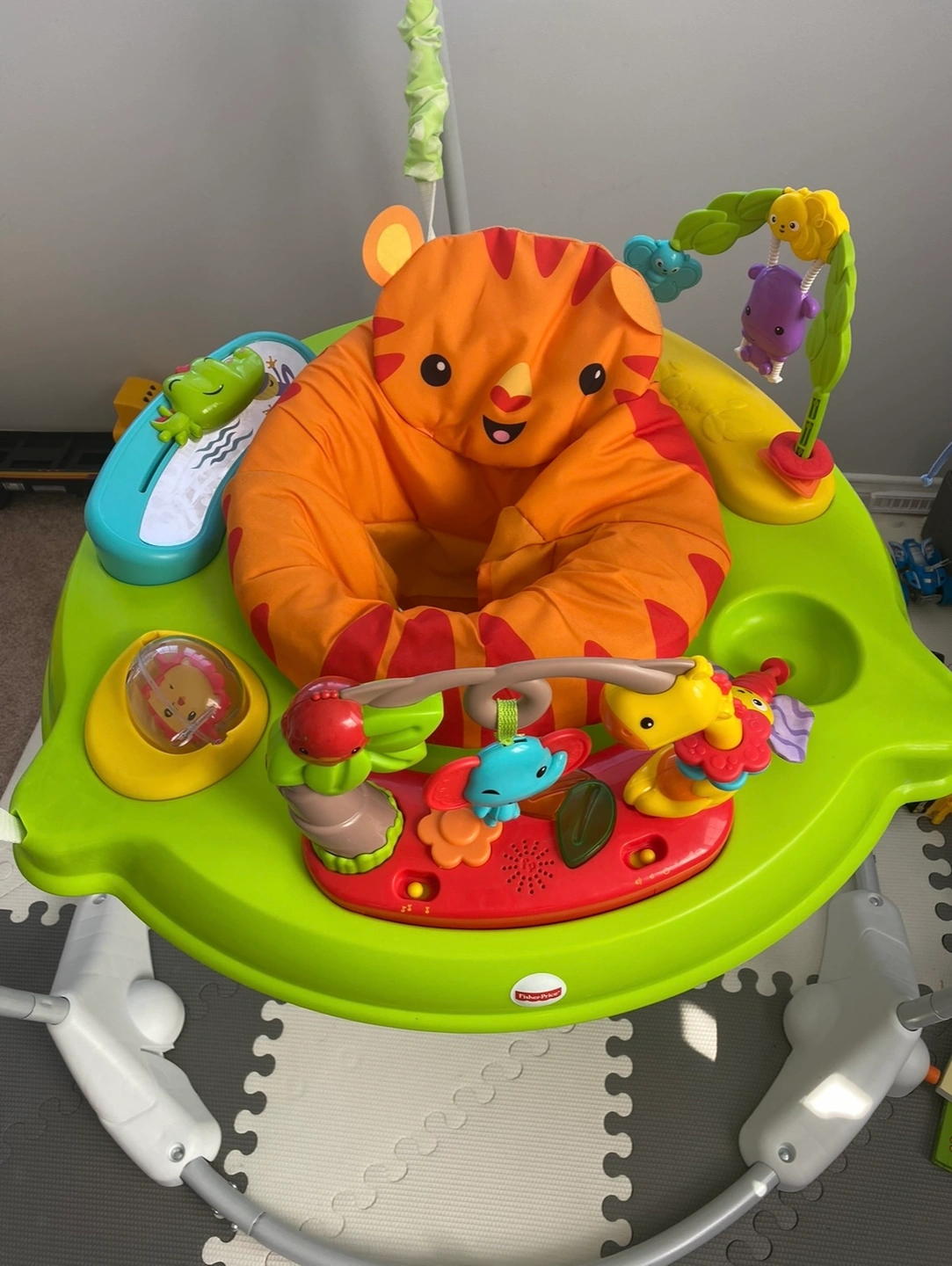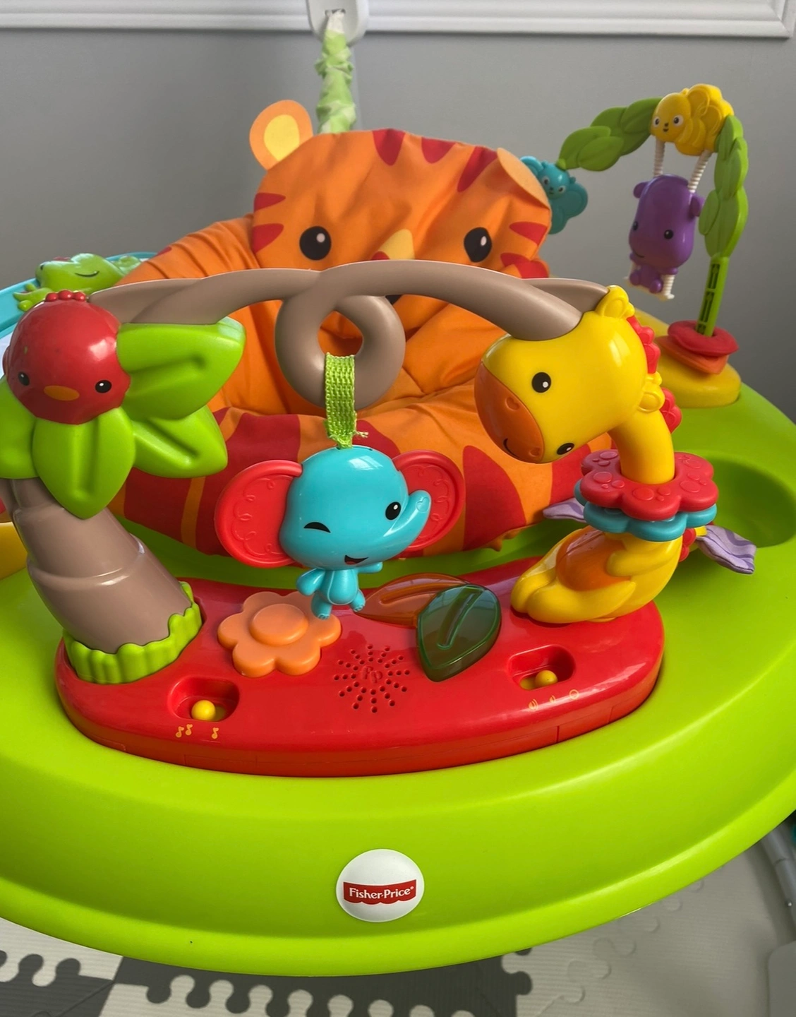 This is a jungle-themed baby jumperoo that comes with several features that make it fun and engaging for your little one.