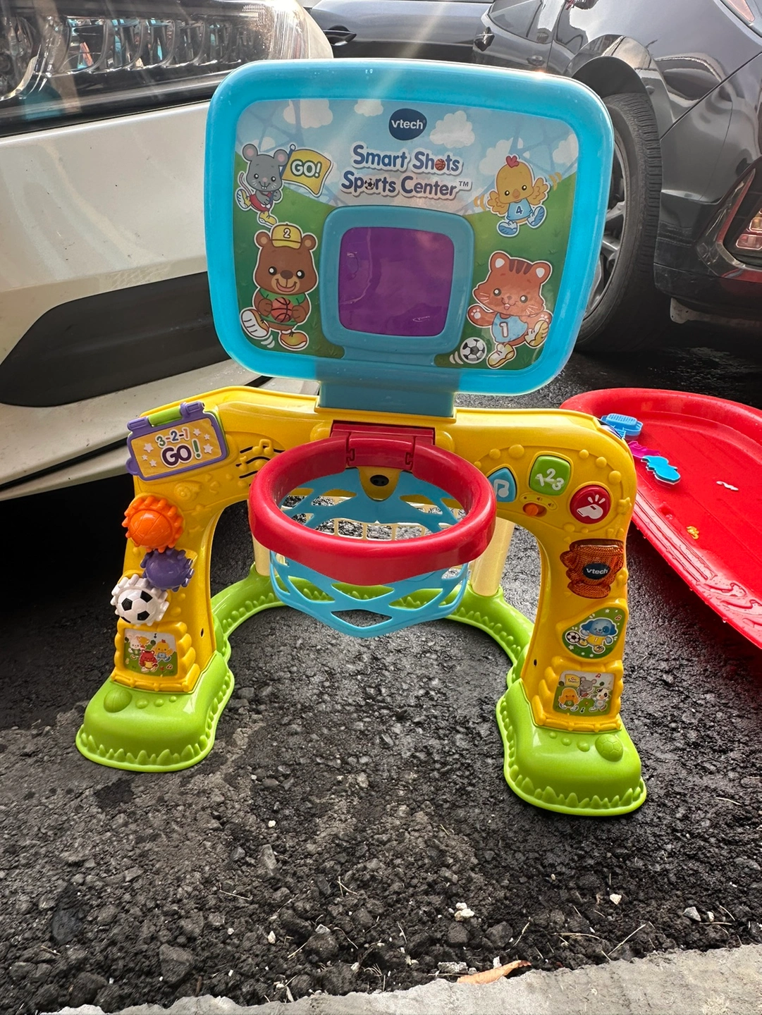 VTech interactive basketball toy for toddlers. Includes lights, sounds, and different game modes. Can be used as a hoop or a stand-up toy. Great for learning about numbers and colours. Requires batteries (not included). Comes with a basketball.
