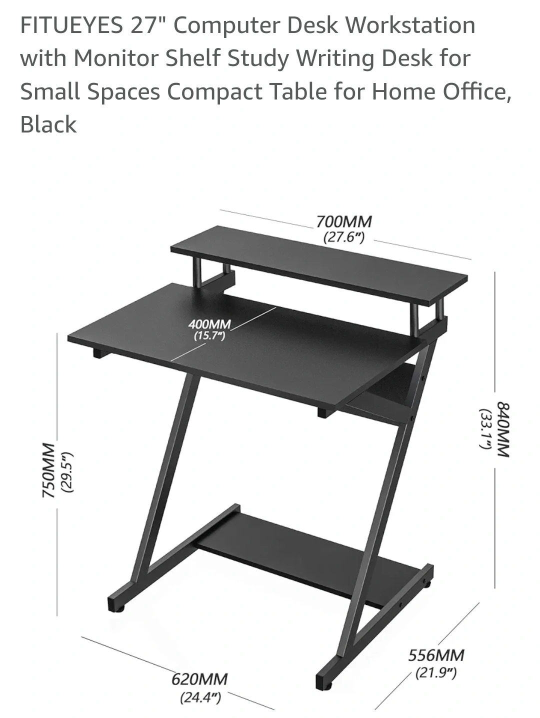FITUEYES 27" Computer Desk Workstation with Monitor Shelf Study Writing Desk for Small Spaces Compact Table for Home Office, Black https://a.co/d/dOA97CR