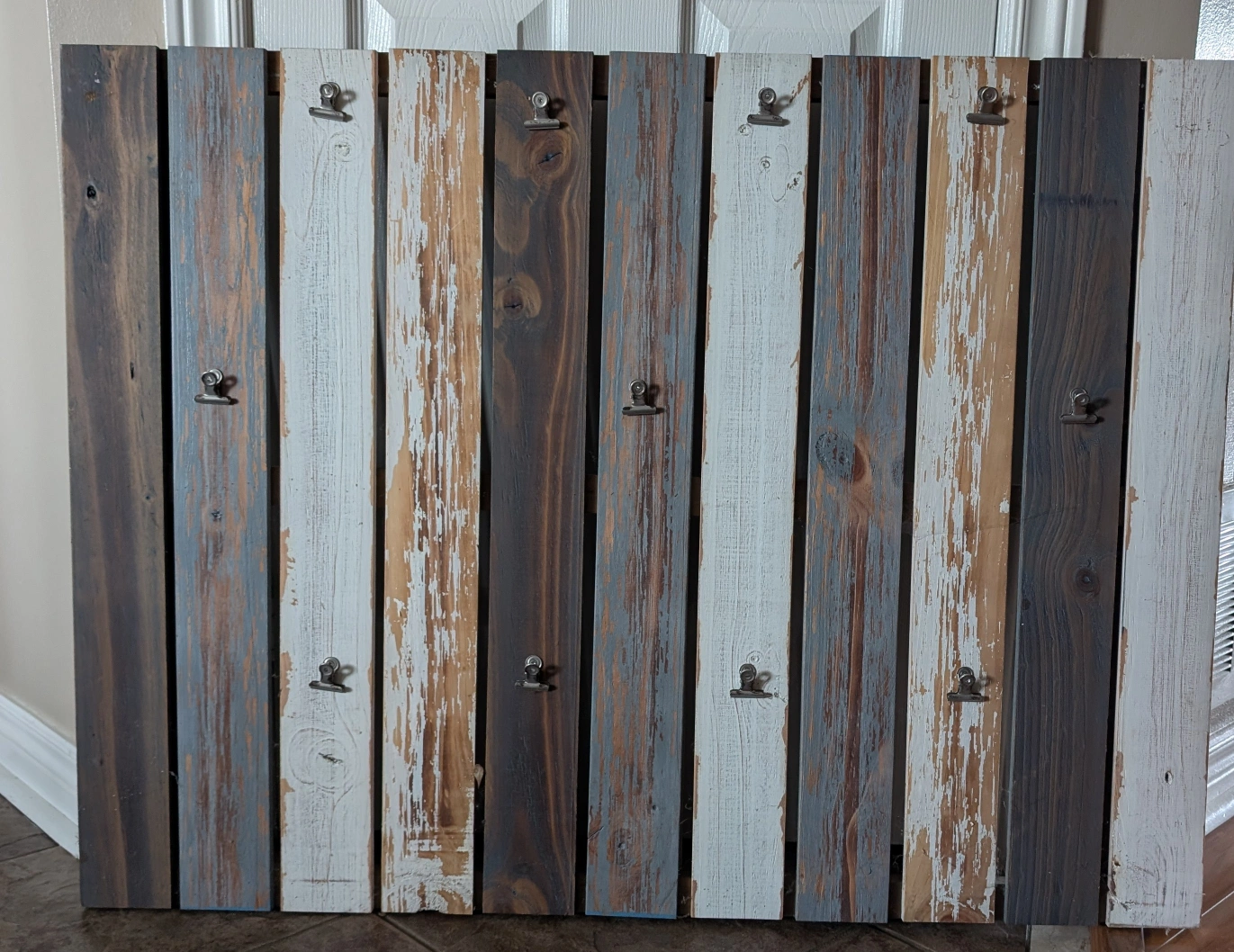 A reclaimed wood picture board with clips. Perfect for showcasing your favourite photos. Also can be used as a party seating chart.