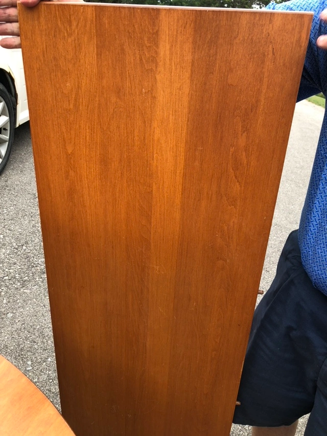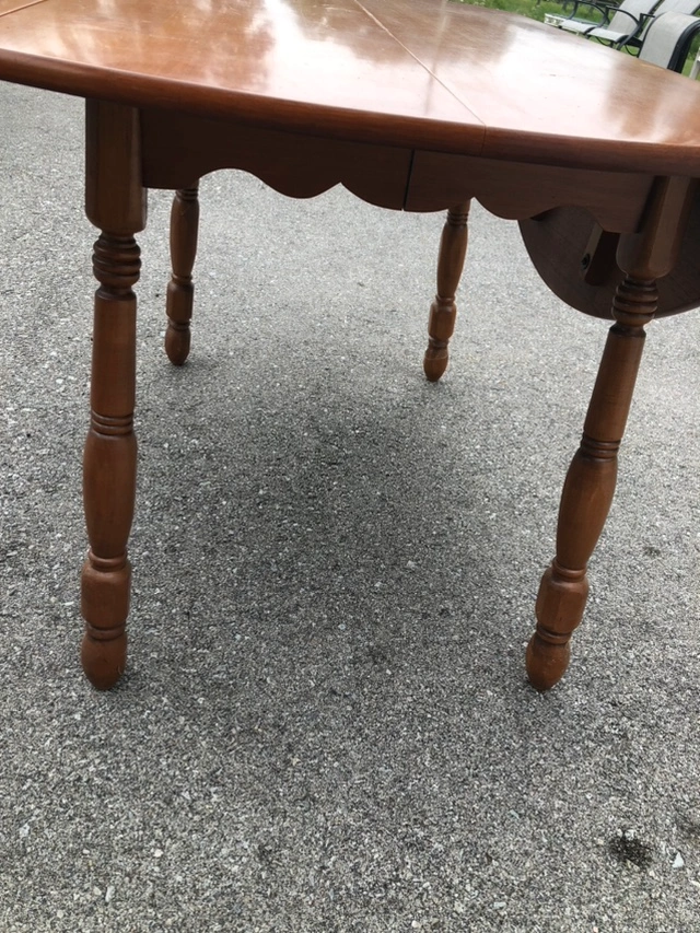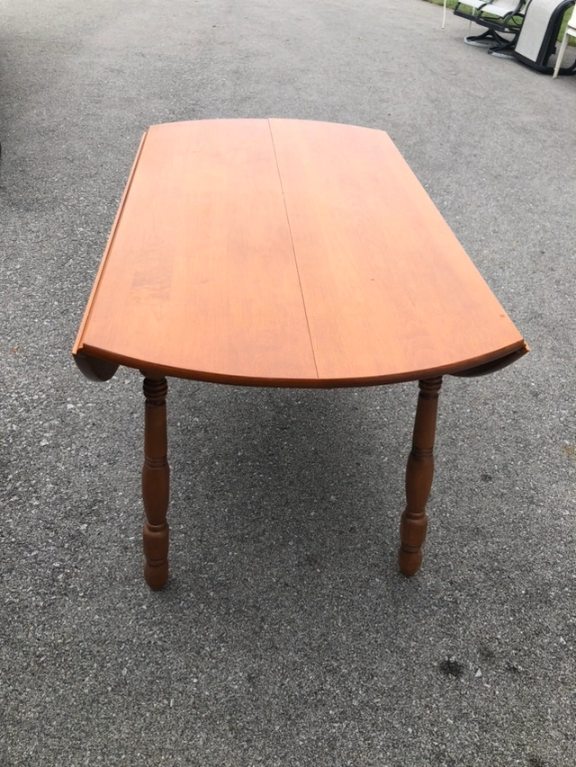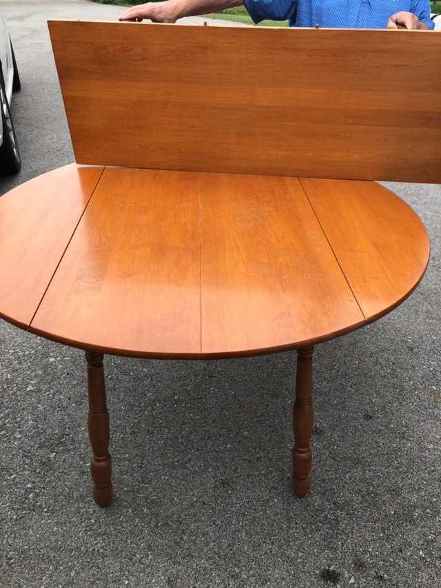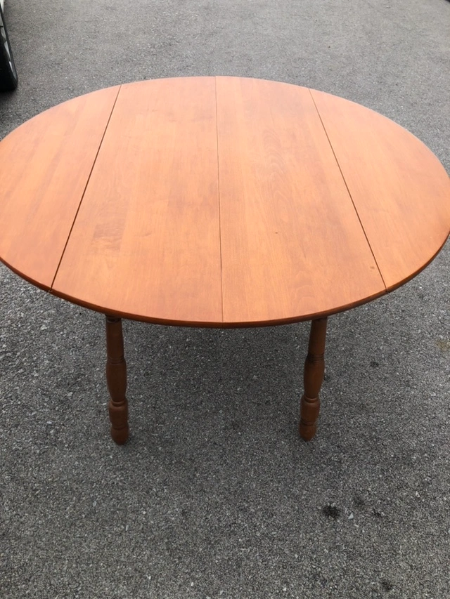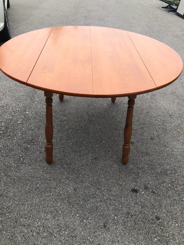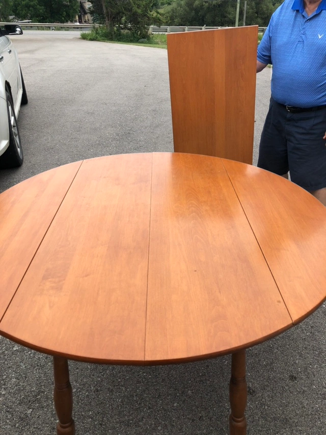 Solid Maple very versatile table. Sides fold down, extend or add the extra leaf for 68 inch wide table. Very good condition.