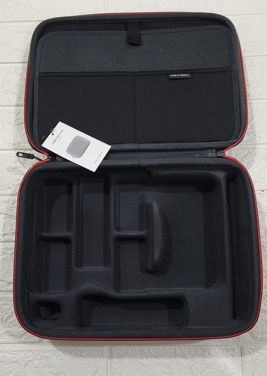 Black carrying case with compartments for various accessories.