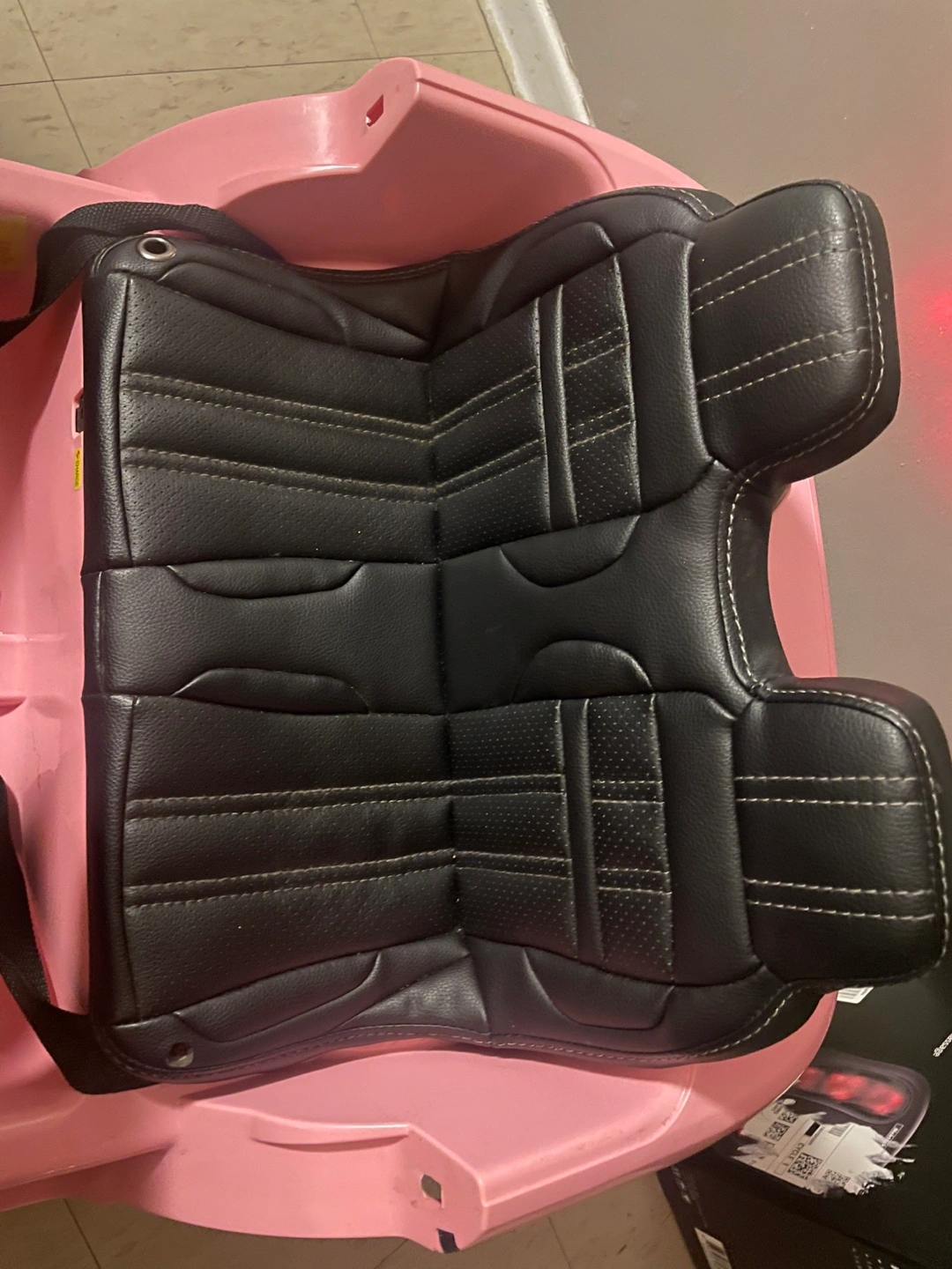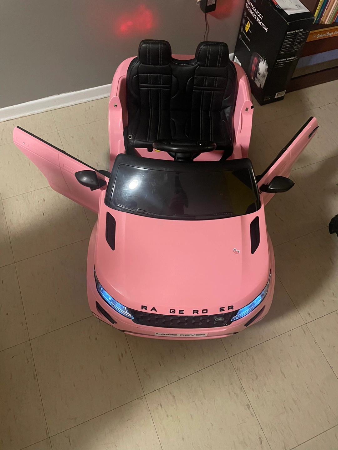 Pink children's ride-on car. Features two black leather-like seats and opening doors. Resembles a Land Rover Range Rover.