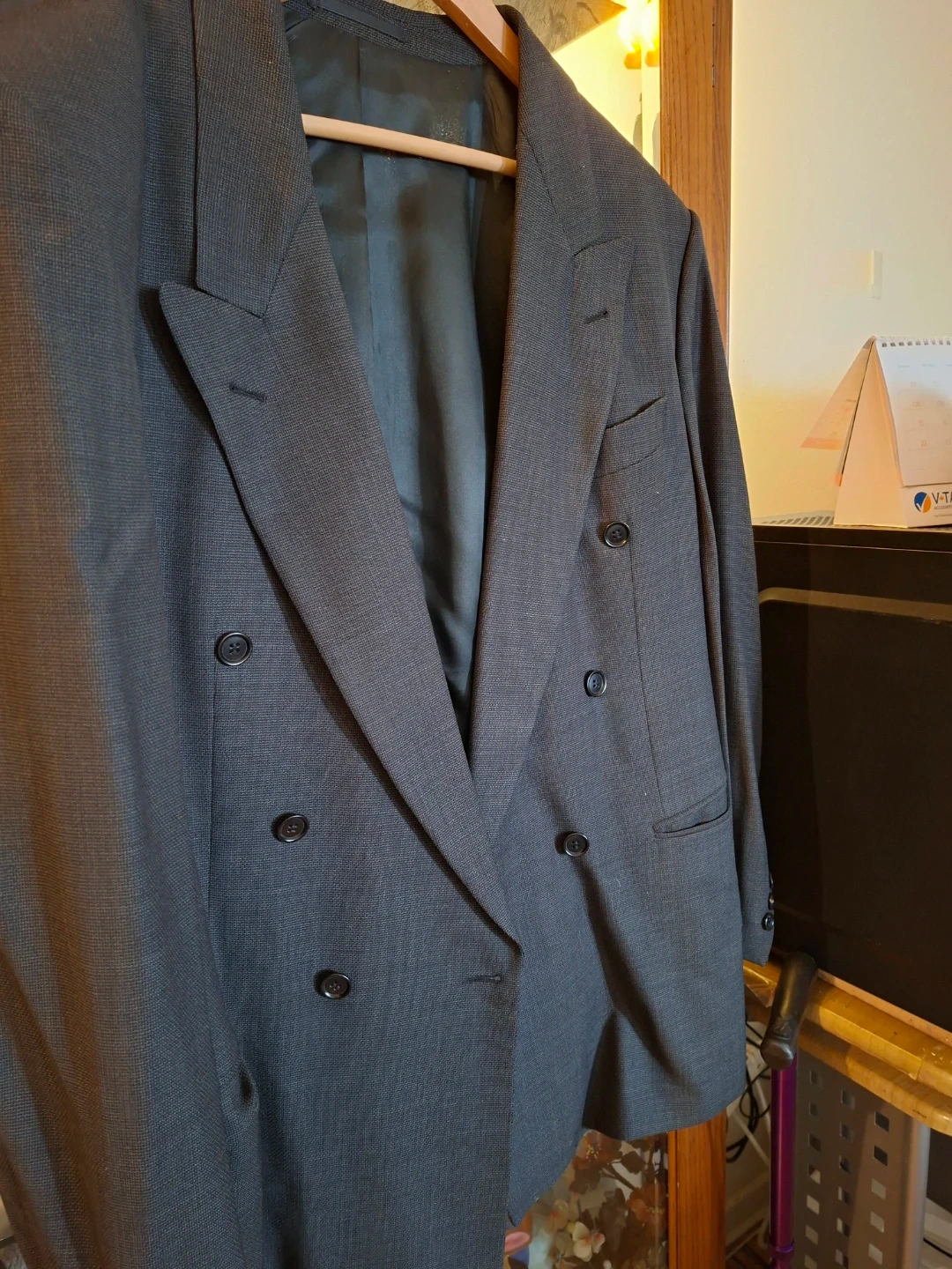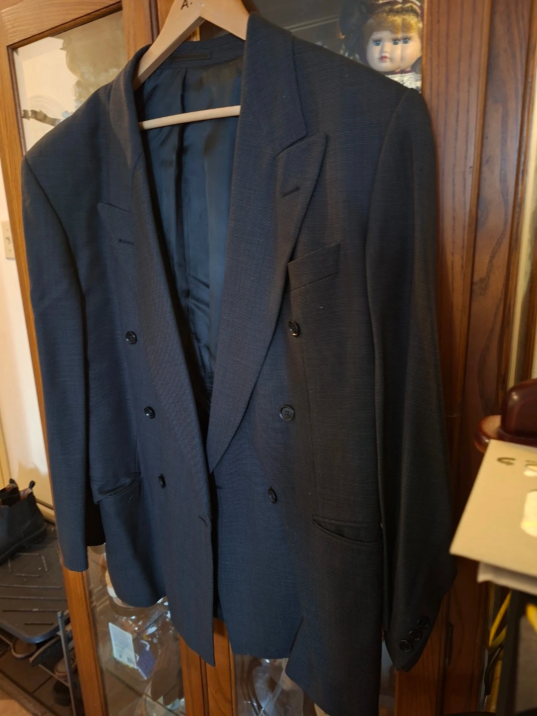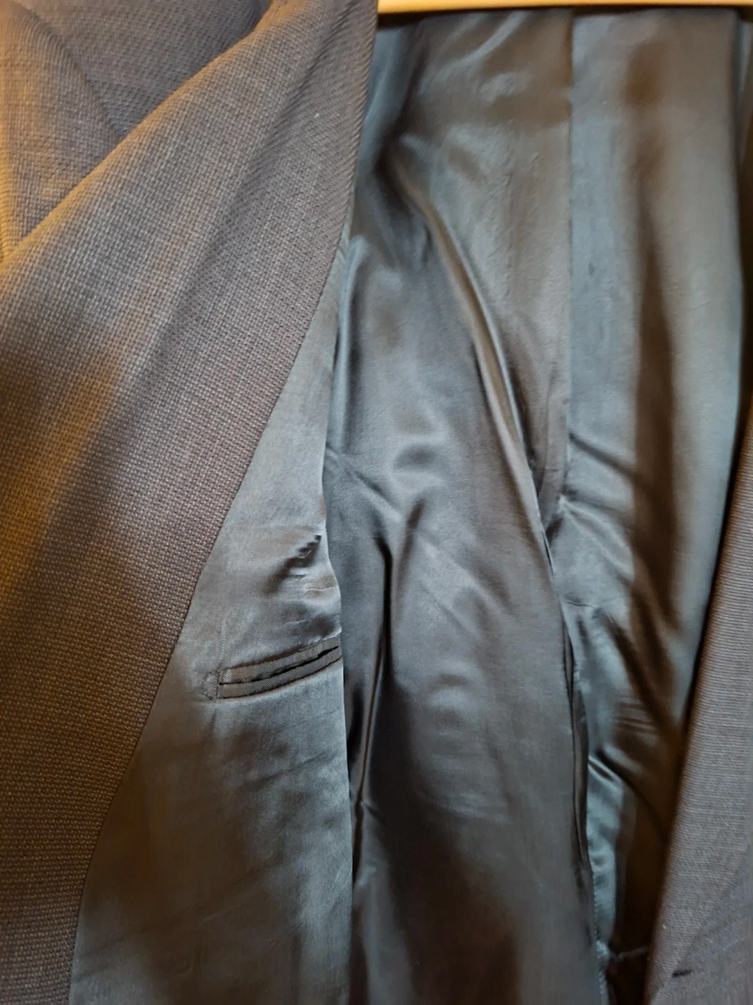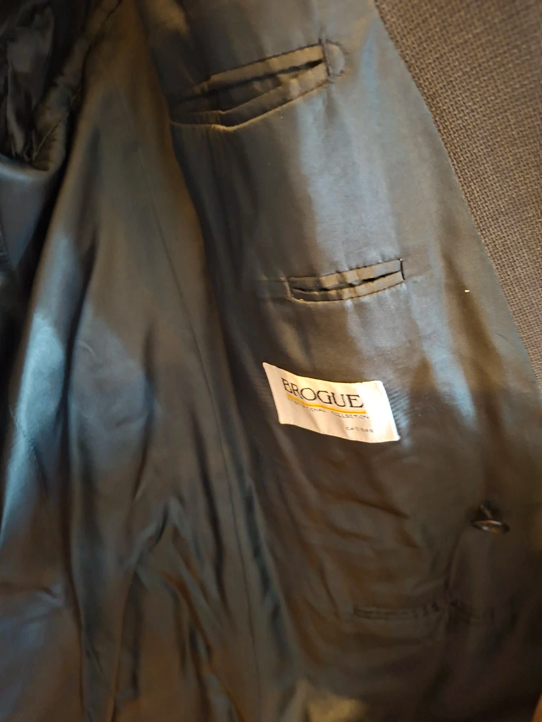This is a BROGUE double-breasted blazer. It's a classic suit jacket with a dark colour and a satin lining. Comes with a chest pocket and two front pockets.