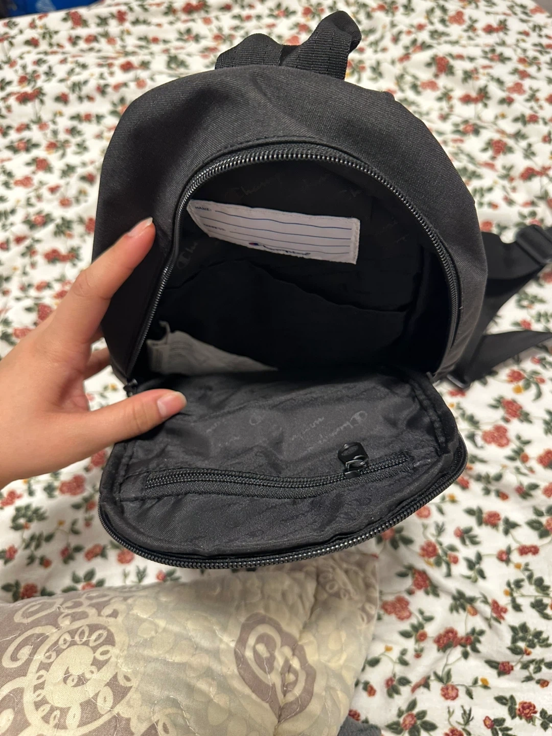 Here's a black Champion sling bag! It's in great condition and perfect for carrying your essentials. The bag has a main compartment and a front pocket for easy access to your belongings