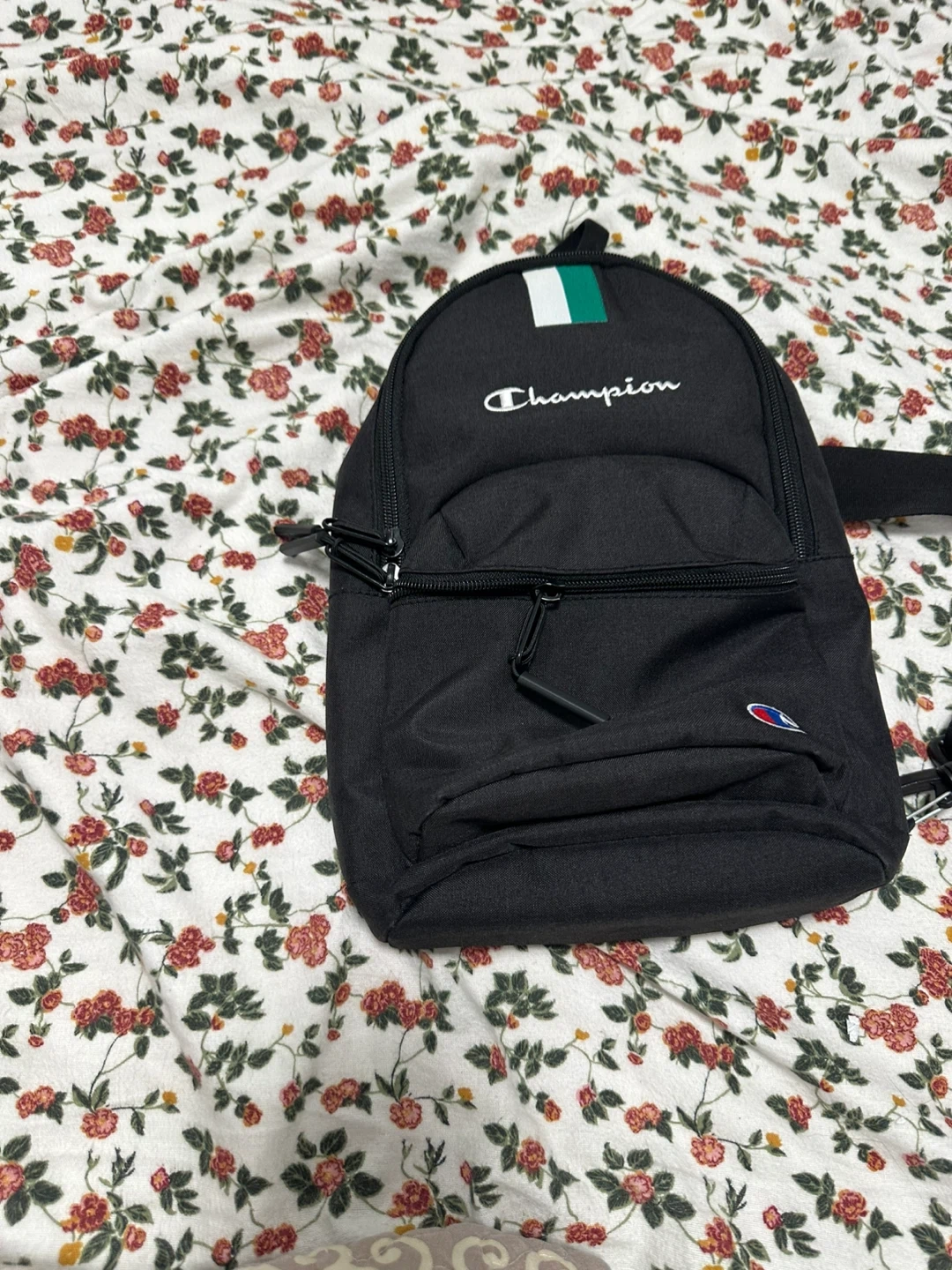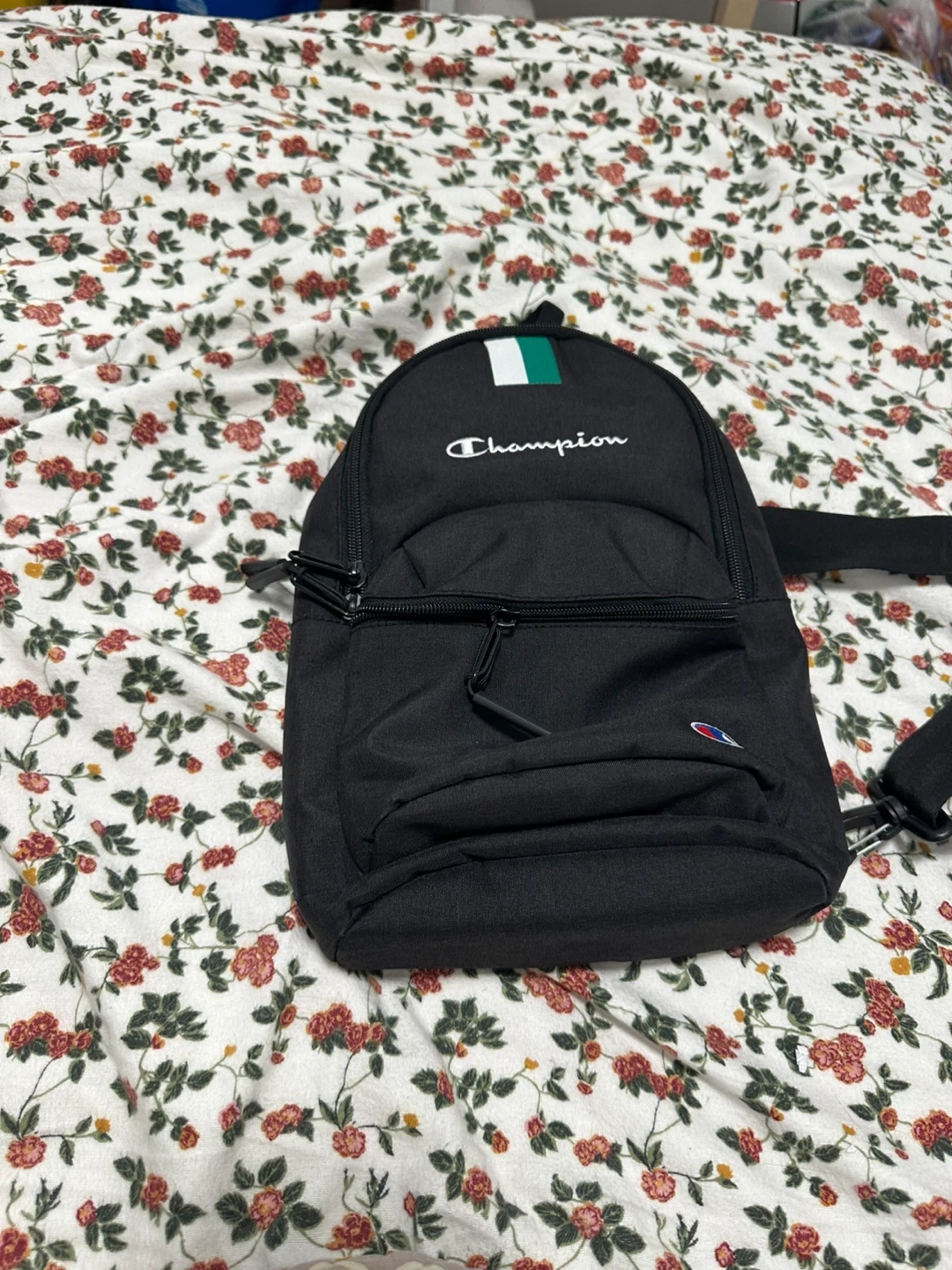 Here's a black Champion sling bag! It's in great condition and perfect for carrying your essentials. The bag has a main compartment and a front pocket for easy access to your belongings