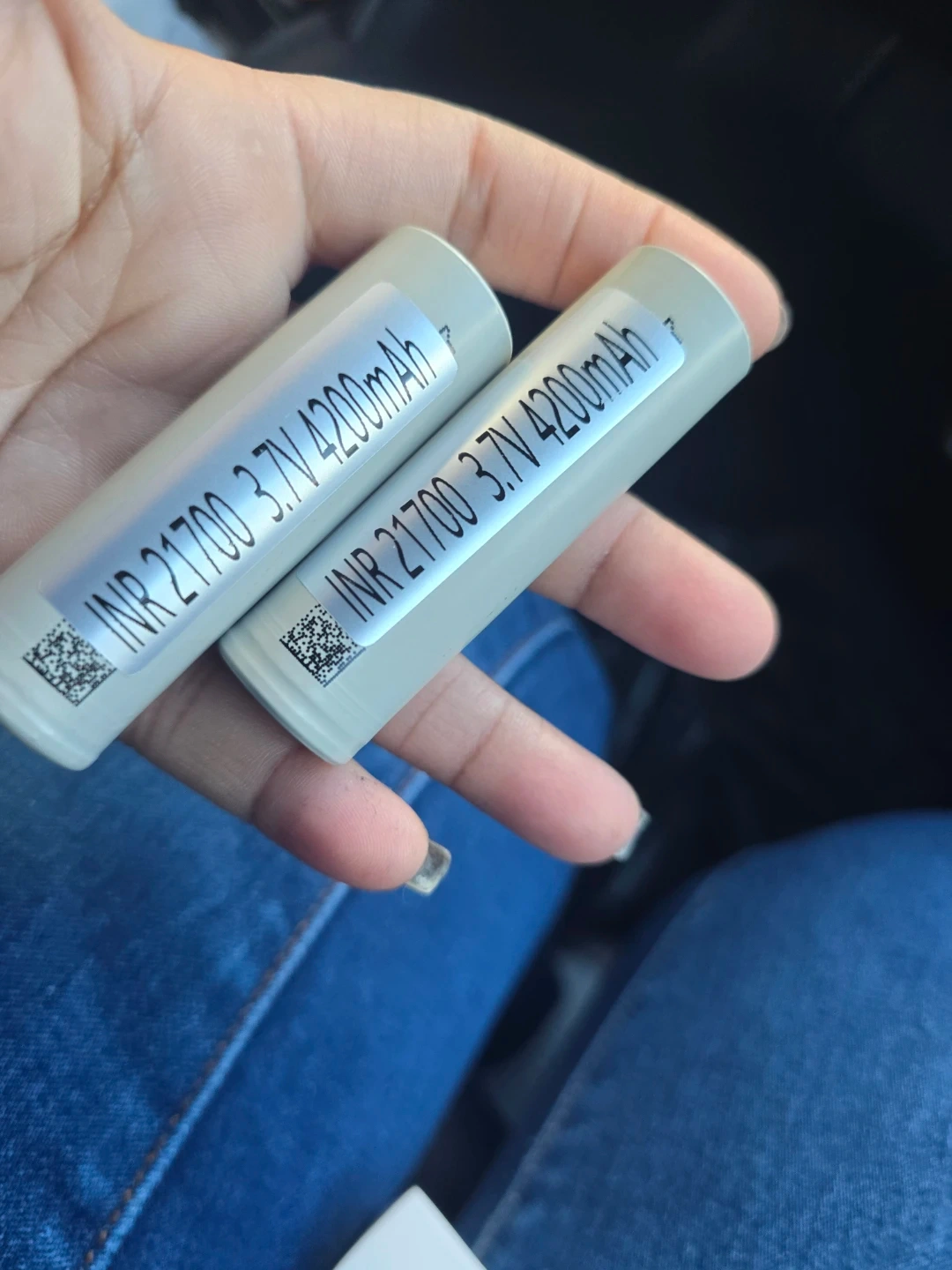 Two INR 21700 rechargeable batteries. Each battery is rated at 3.7V with a 4200mAh capacity. These are lithium-ion cells.