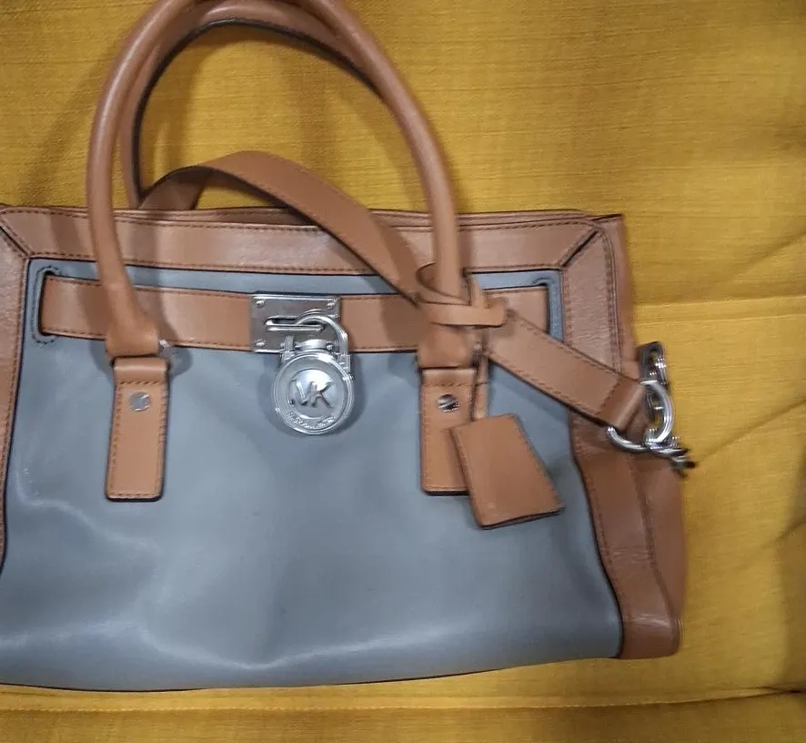 Stylish Michael Kors tote bag in grey and tan leather. It's a classic design with gold-tone hardware, including the signature padlock charm. This bag is perfect for everyday use!