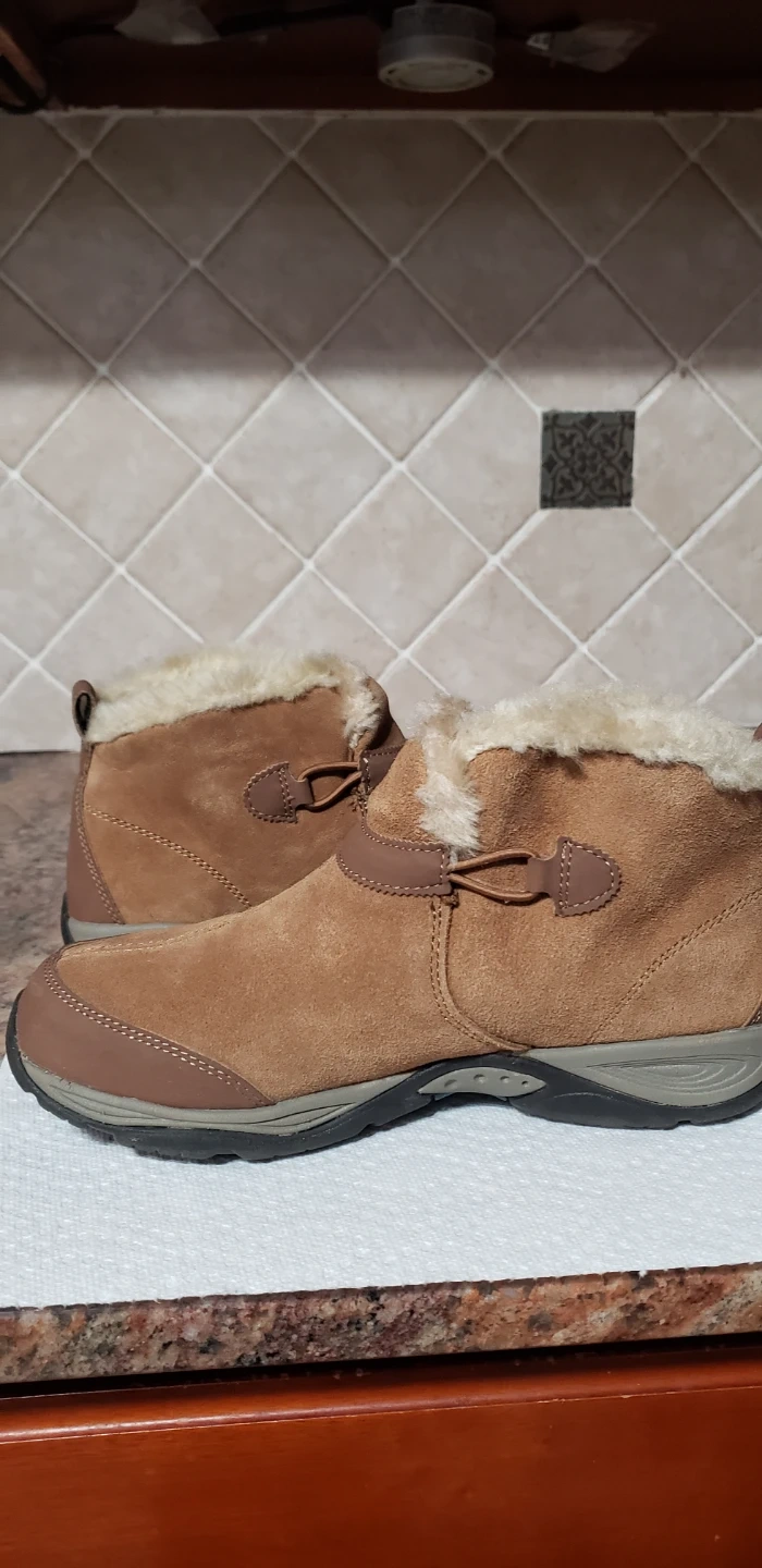 Cozy brown suede ankle boots from Easy Spirit! These boots have a faux fur lining and a toggle closure. They are in good condition and ready for a new owner