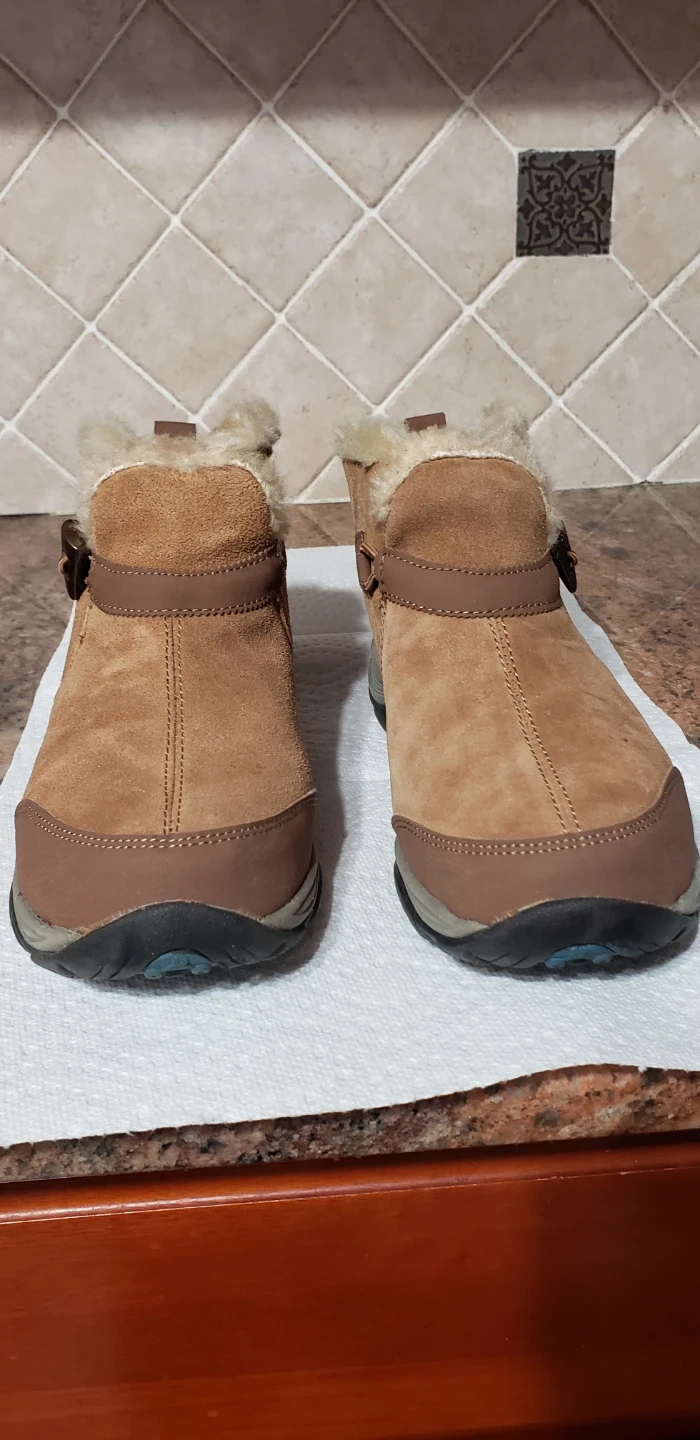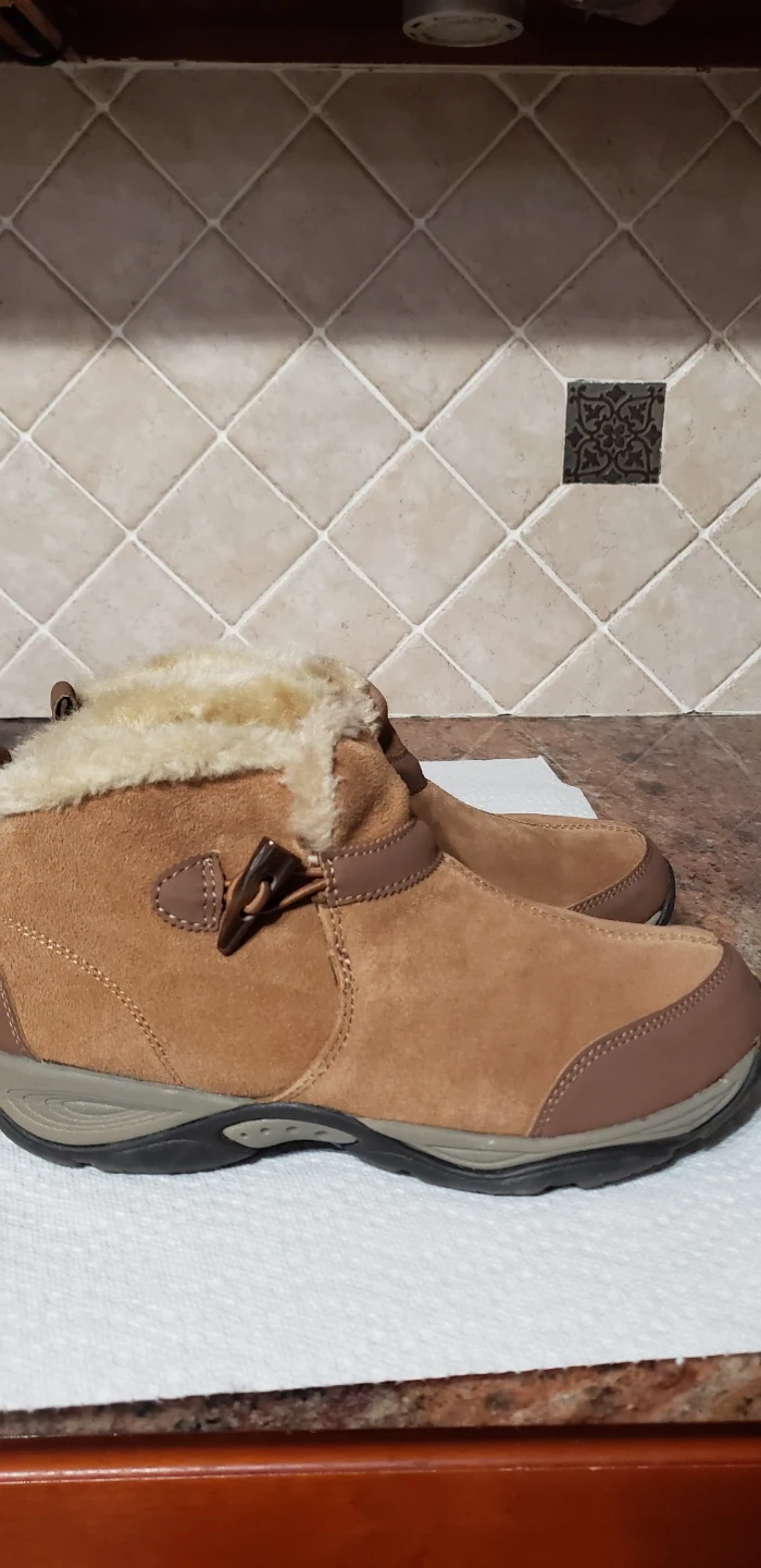 Cozy brown suede ankle boots from Easy Spirit! These boots have a faux fur lining and a toggle closure. They are in good condition and ready for a new owner